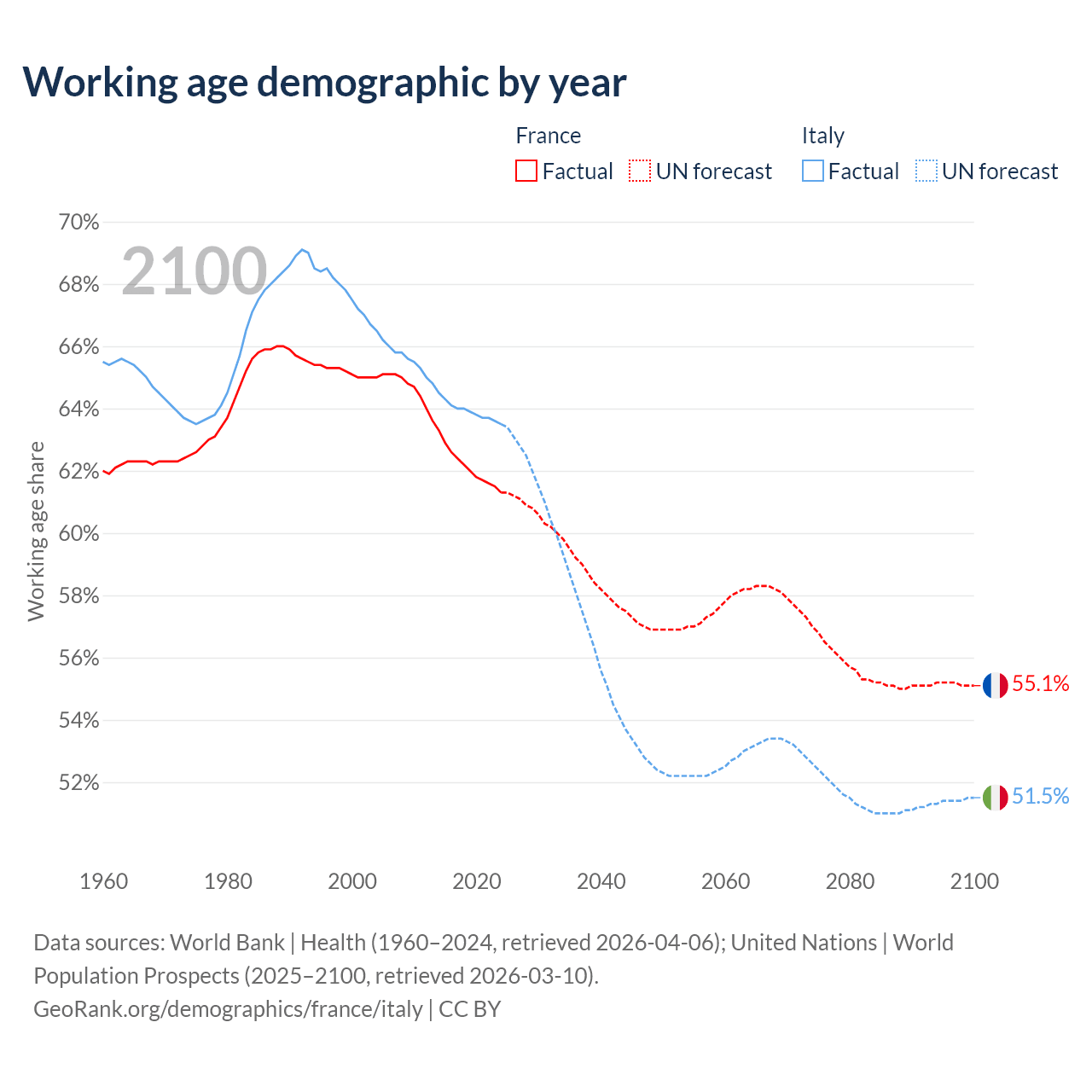 Median age France vs Italy, 1960-2100