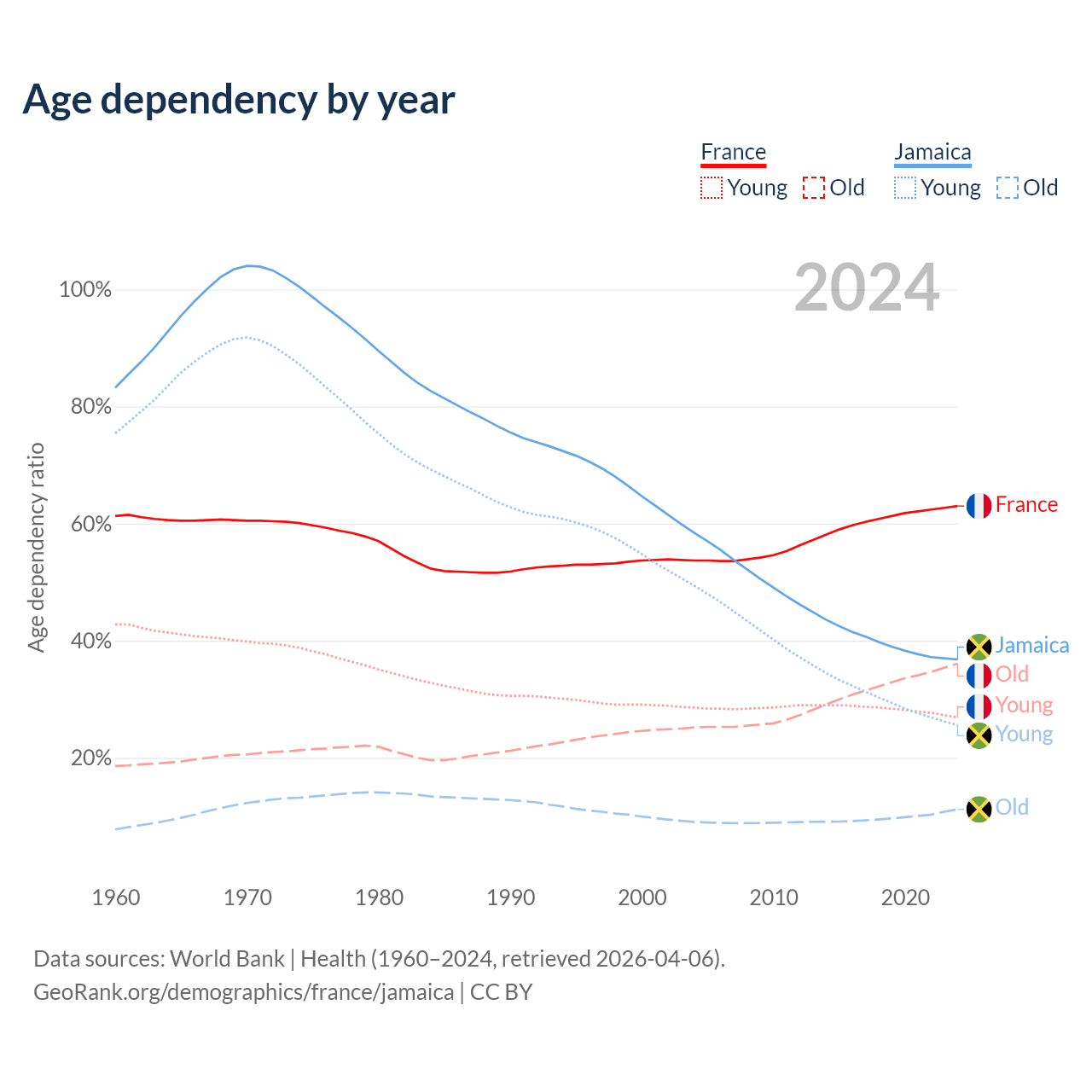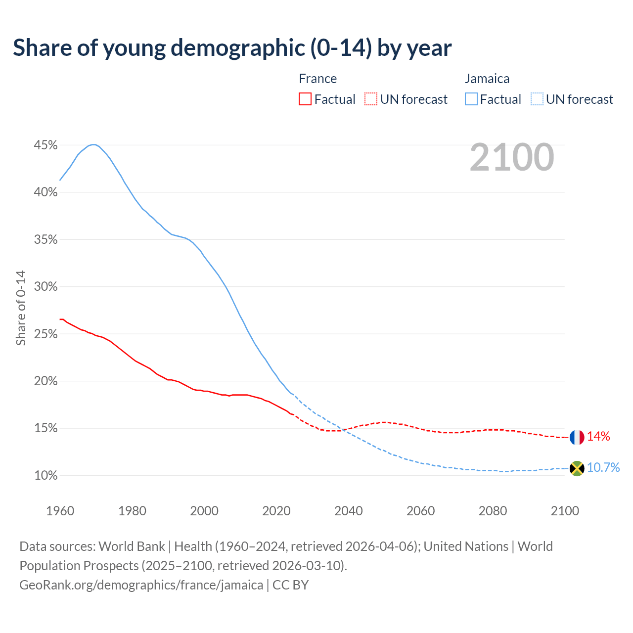 - The share of young demographic (0-15 years old) in France is 16.5% vs 18.7% in Jamaica.
