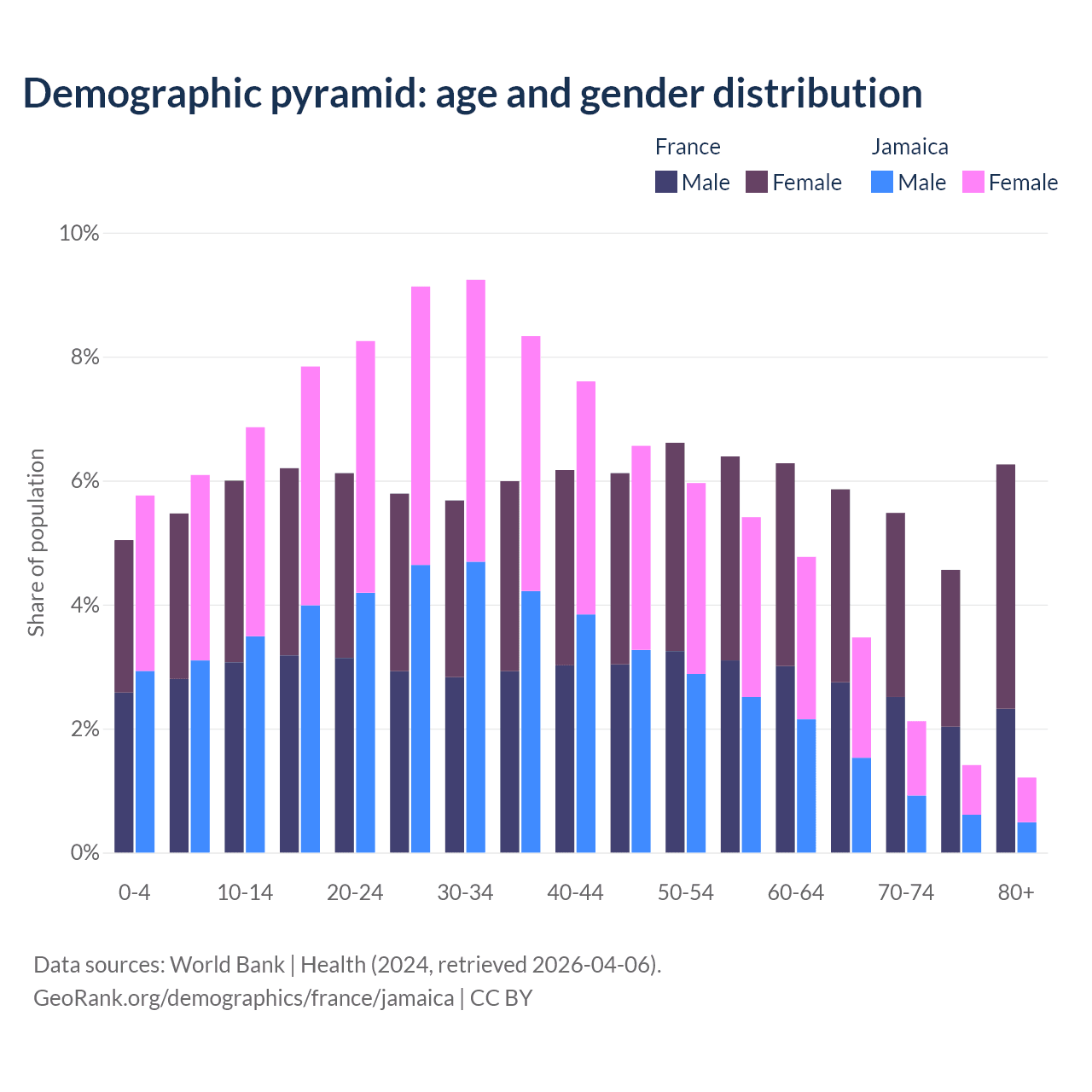 - As of 2026, the population of France is 68.8M vs 2.83M in Jamaica - 24.3 times difference.