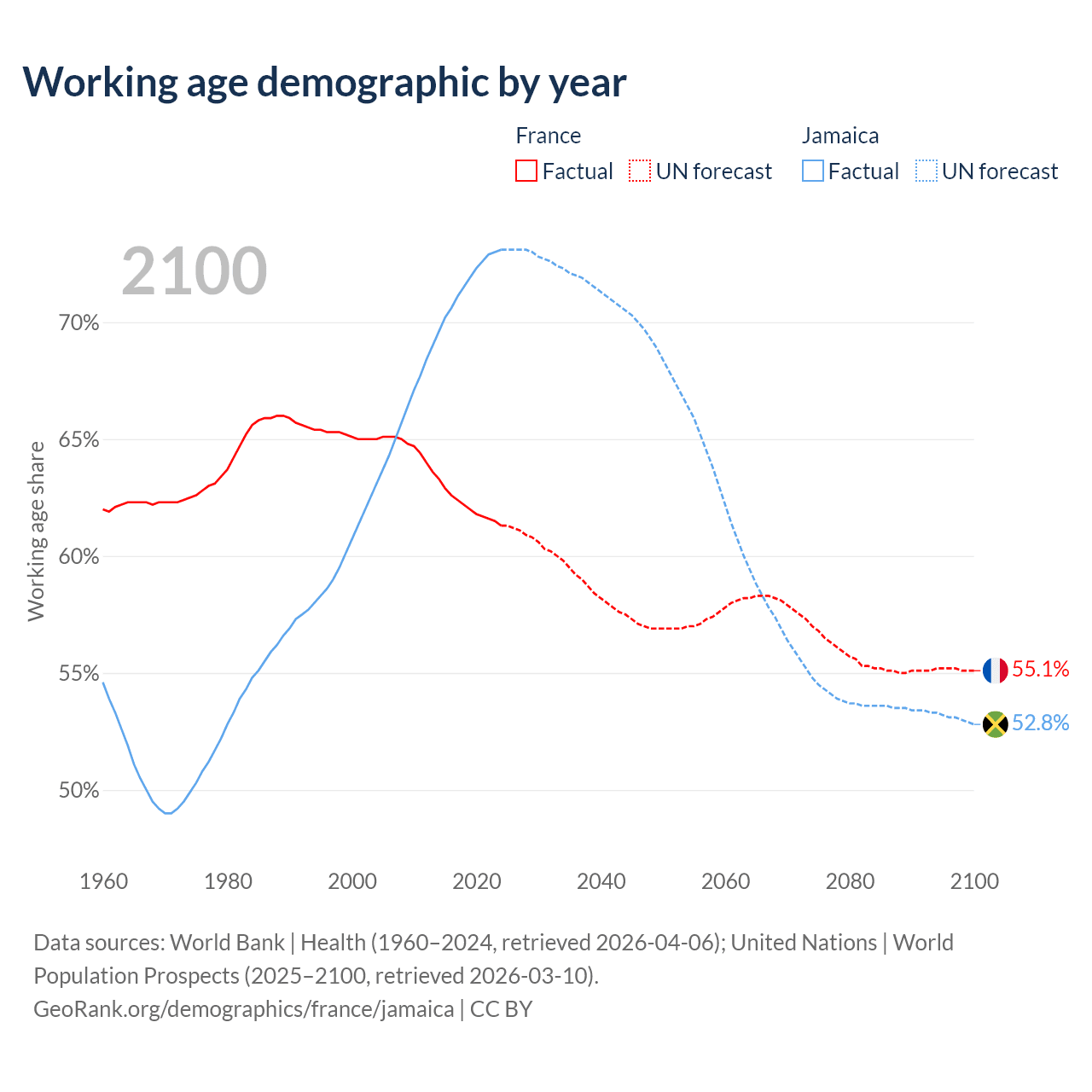 - France has 42.2M working age adults (aged 15-64) vs 2.07M in Jamaica.