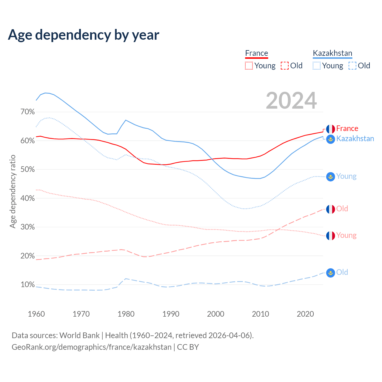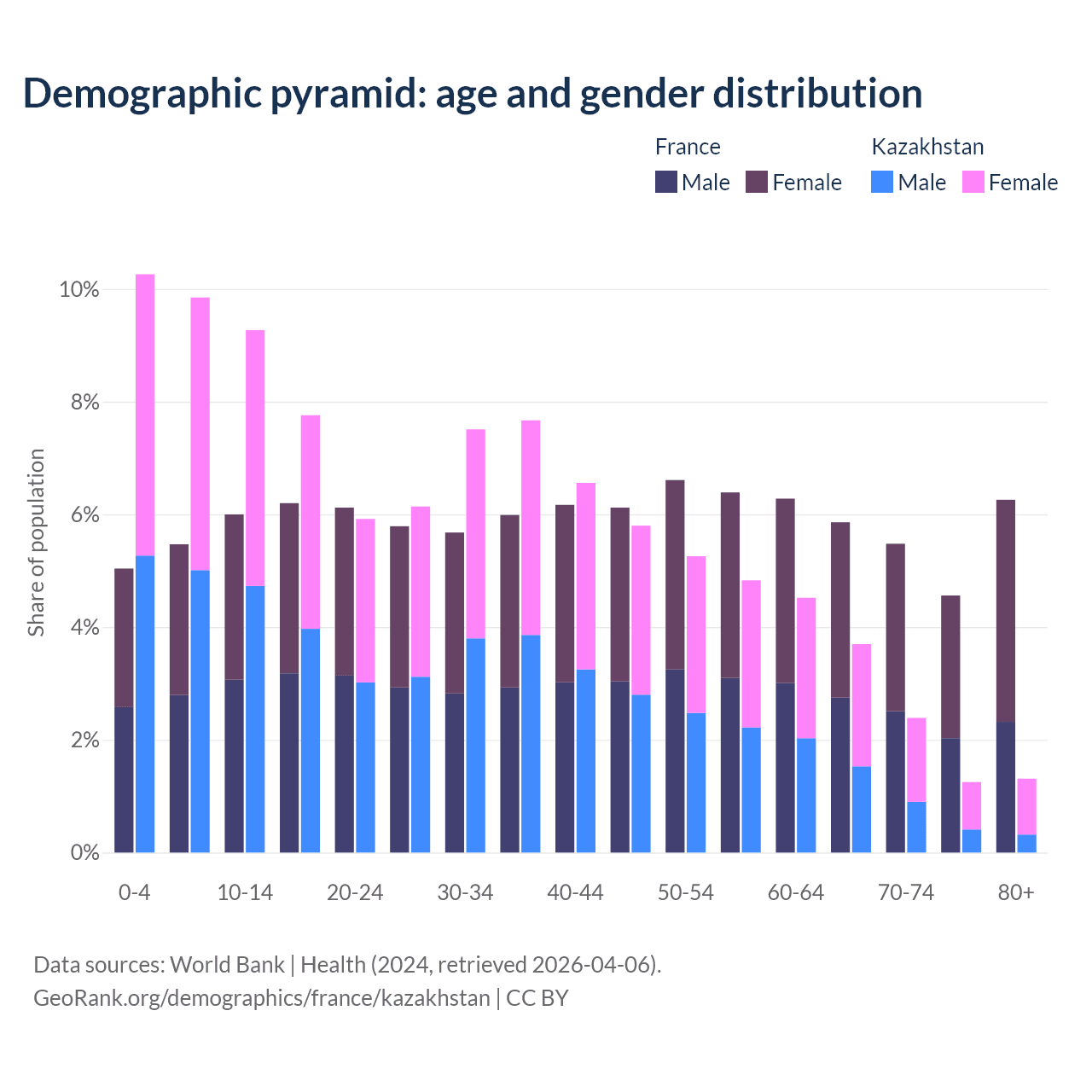 - France is ranked 29/196 by median age (oldest to youngest) vs 99/196 for Kazakhstan.