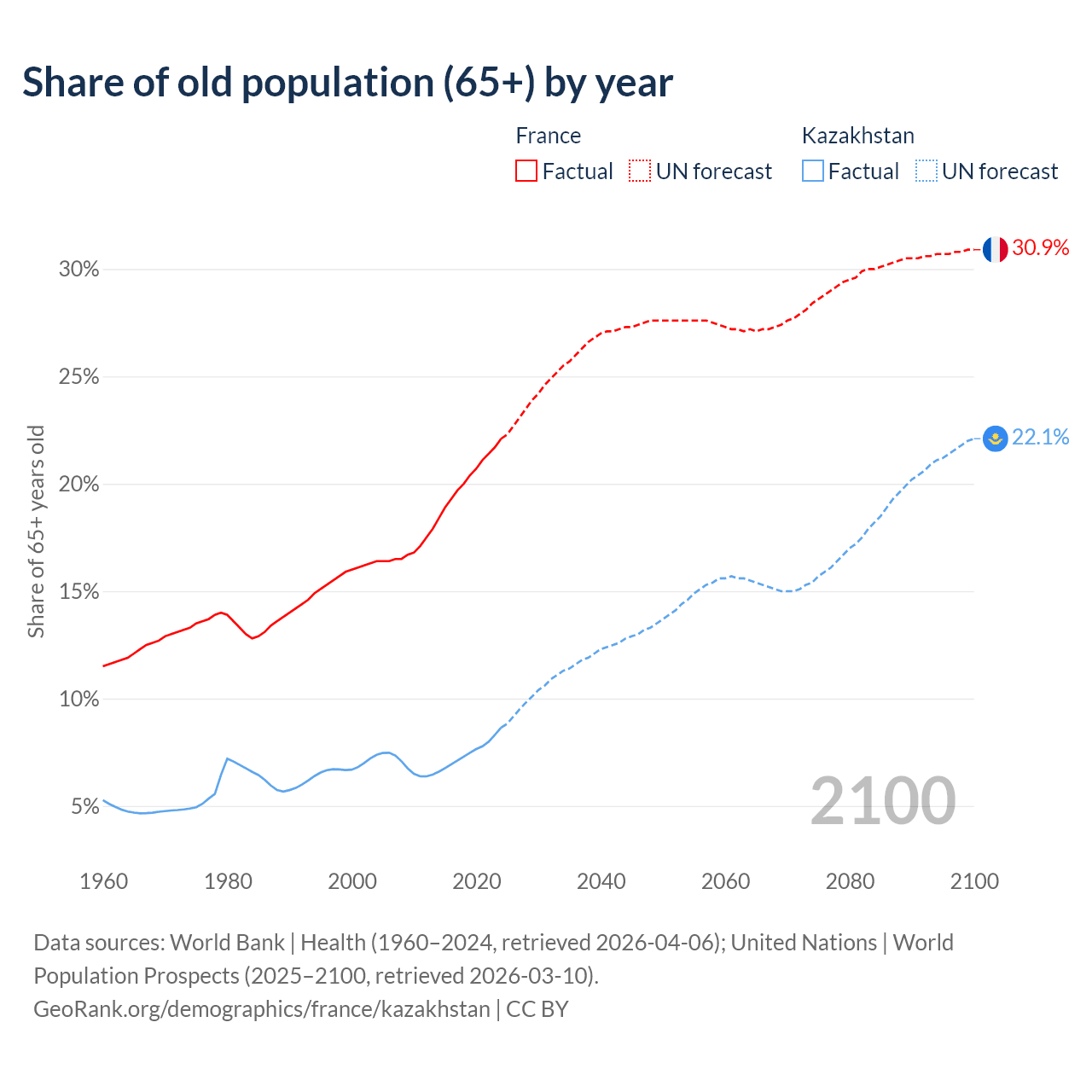 The share of older people aged 65 and over is 22.1% in France and 8.65% in Kazakhstan. Life expectancy in France compared to Kazakhstan .