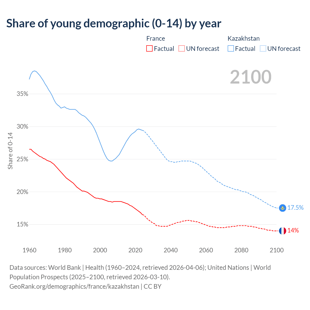 - The share of young demographic (0-15 years old) in France is 16.5% vs 29.4% in Kazakhstan.