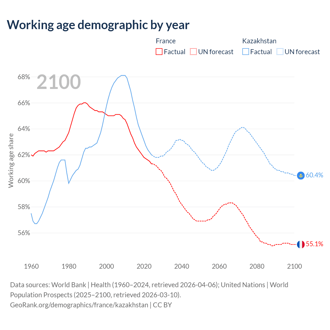- France has 42.2M working age adults (aged 15-64) vs 13.1M in Kazakhstan.