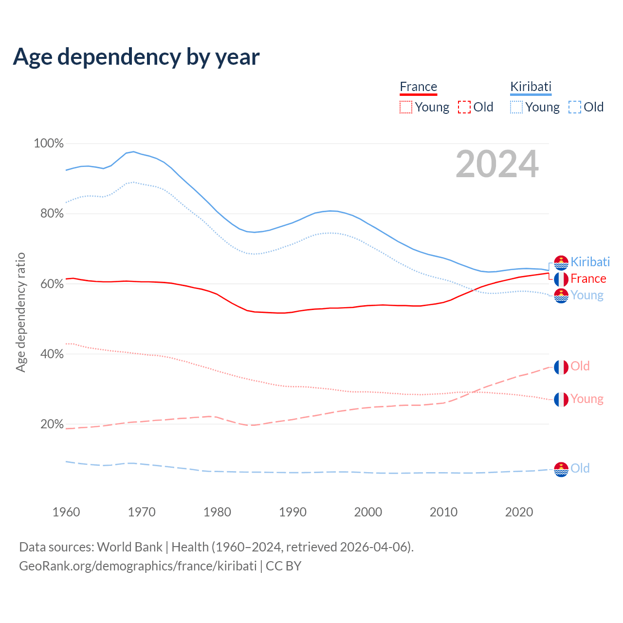 - The share of old-age demographic (65+) in France is 22.1% vs 4.24% in Kiribati.
