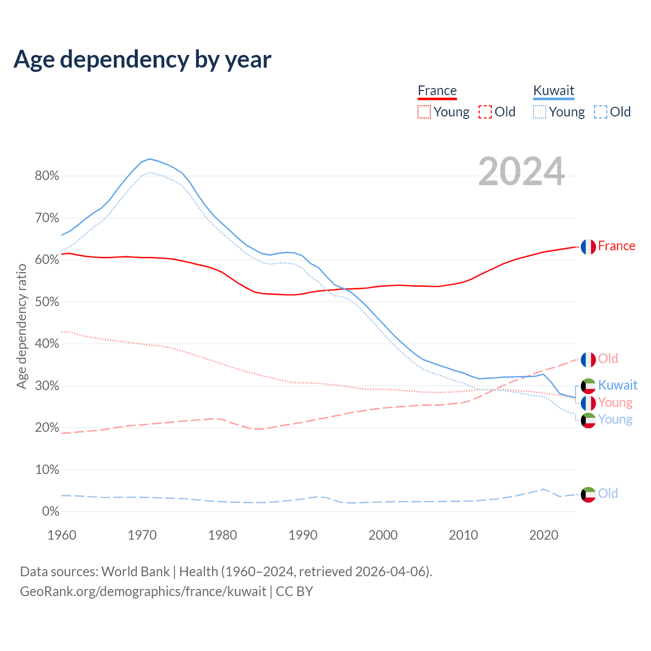 - France is ranked 29/196 by median age (oldest to youngest) vs 71/196 for Kuwait.