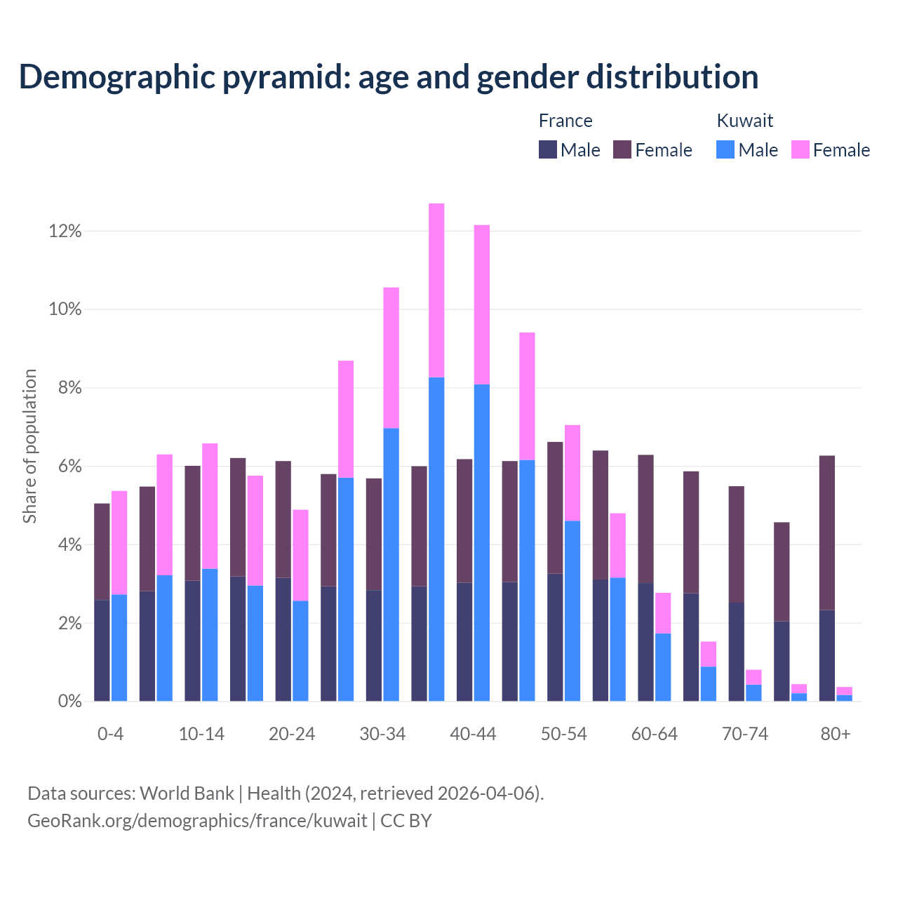 - As of 2026, the population of France is 68.8M vs 5.1M in Kuwait - 13.5 times difference.