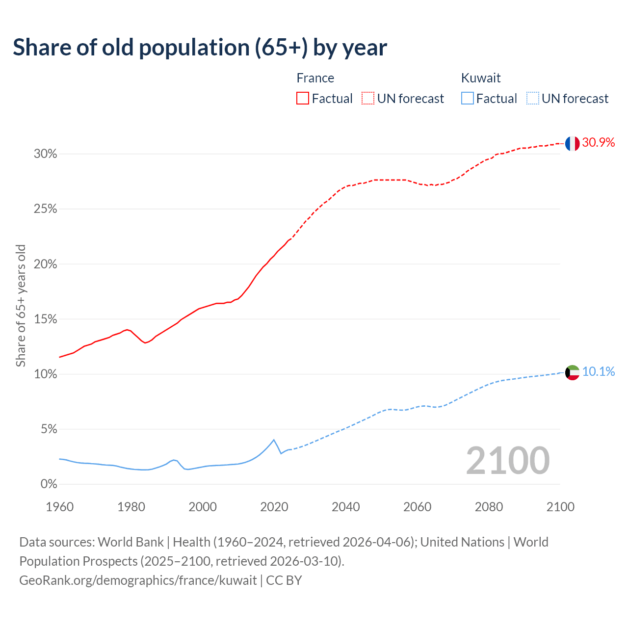 The share of older people aged 65 and over is 22.1% in France and 3.1% in Kuwait. Life expectancy in France compared to Kuwait .