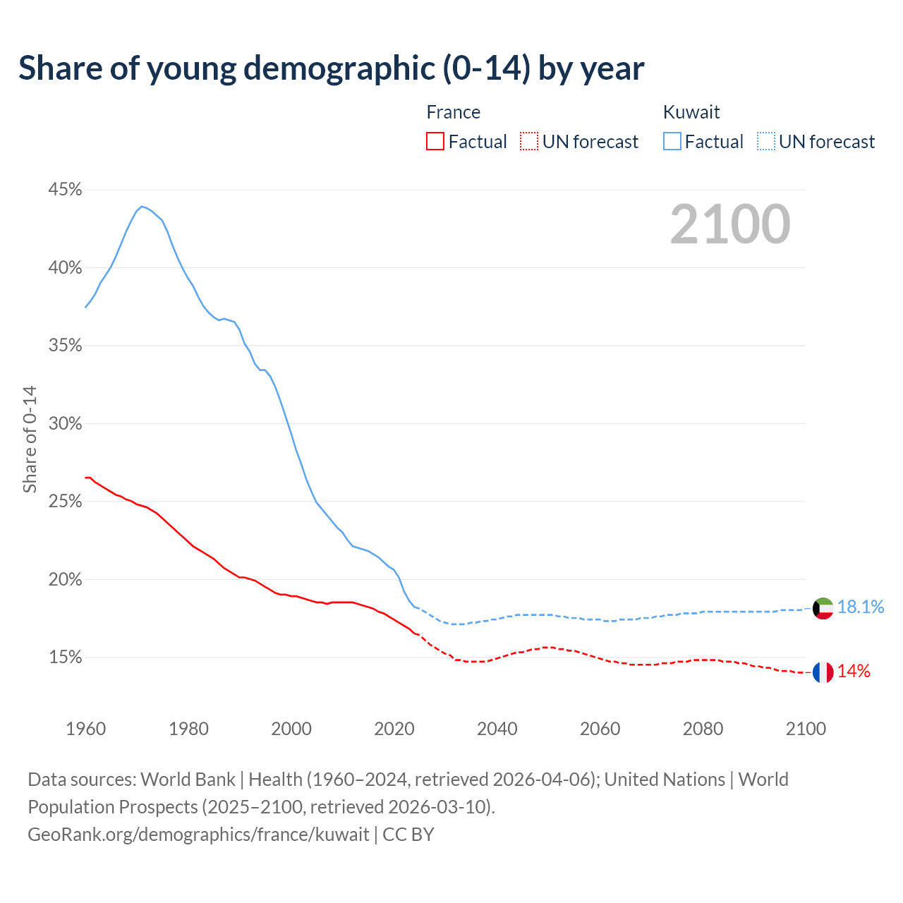 - The share of young demographic (0-15 years old) in France is 16.5% vs 18.2% in Kuwait.