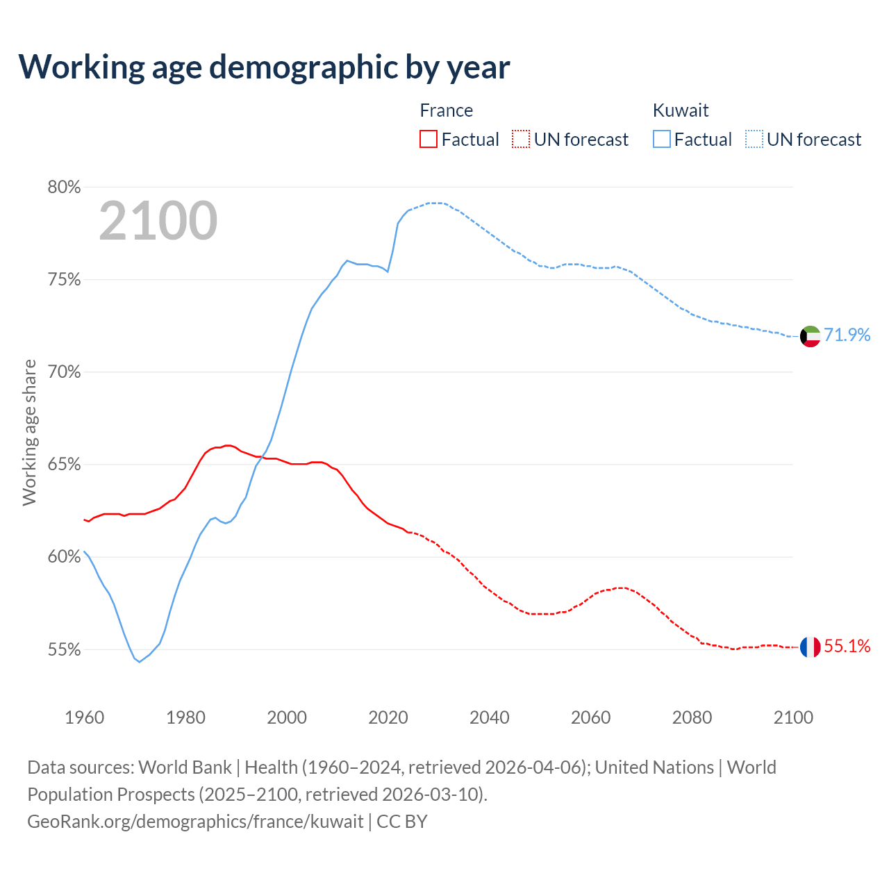 - France has 42.2M working age adults (aged 15-64) vs 4.01M in Kuwait.