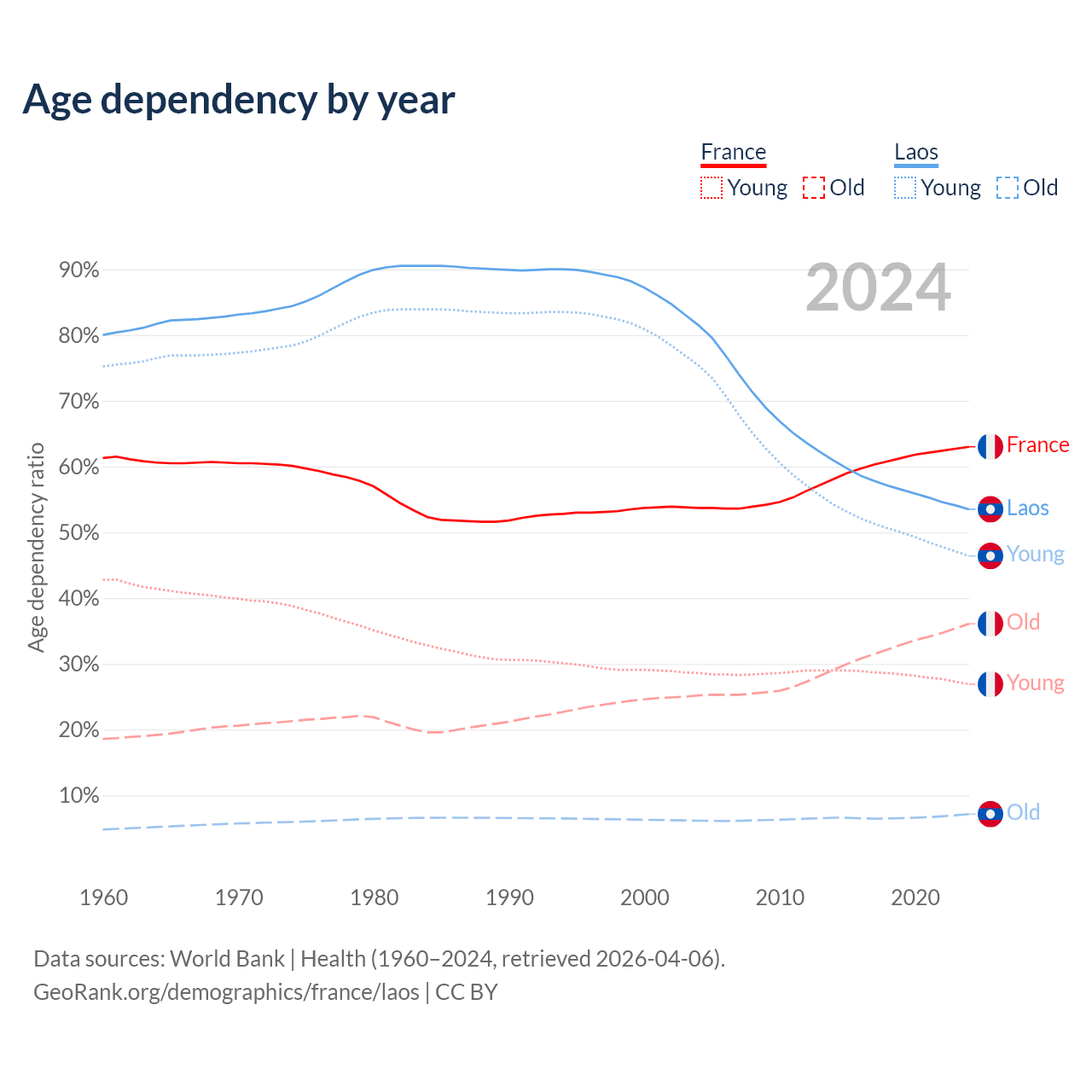 - France is ranked 29/196 by median age (oldest to youngest) vs 130/196 for Laos.