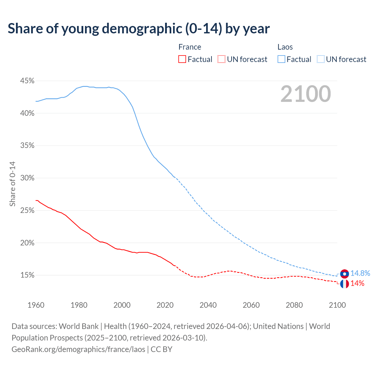 - The share of young demographic (0-15 years old) in France is 16.5% vs 30.2% in Laos.