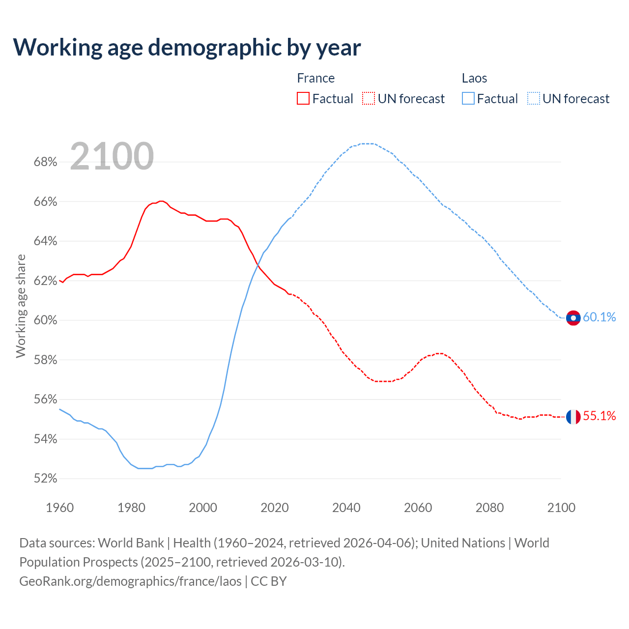 - France has 42.2M working age adults (aged 15-64) vs 5.21M in Laos.
