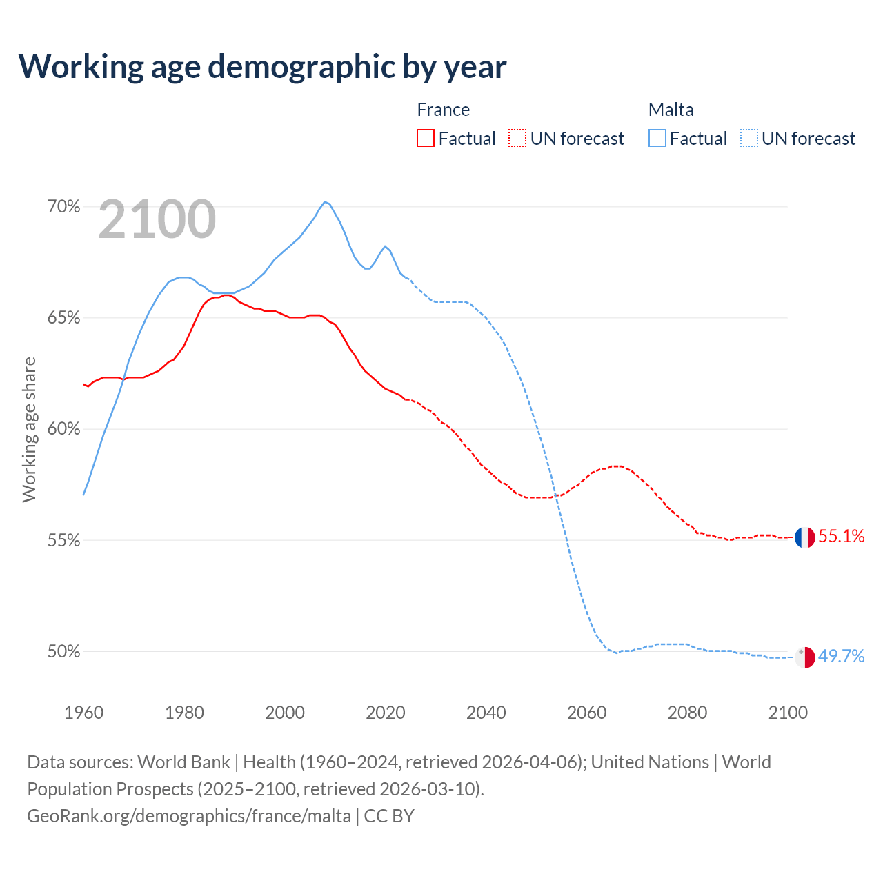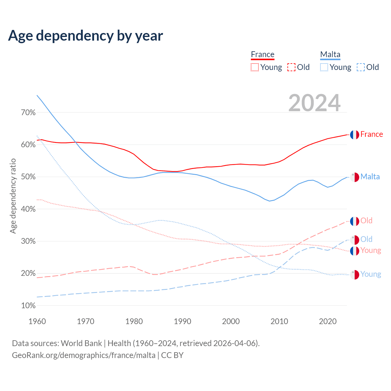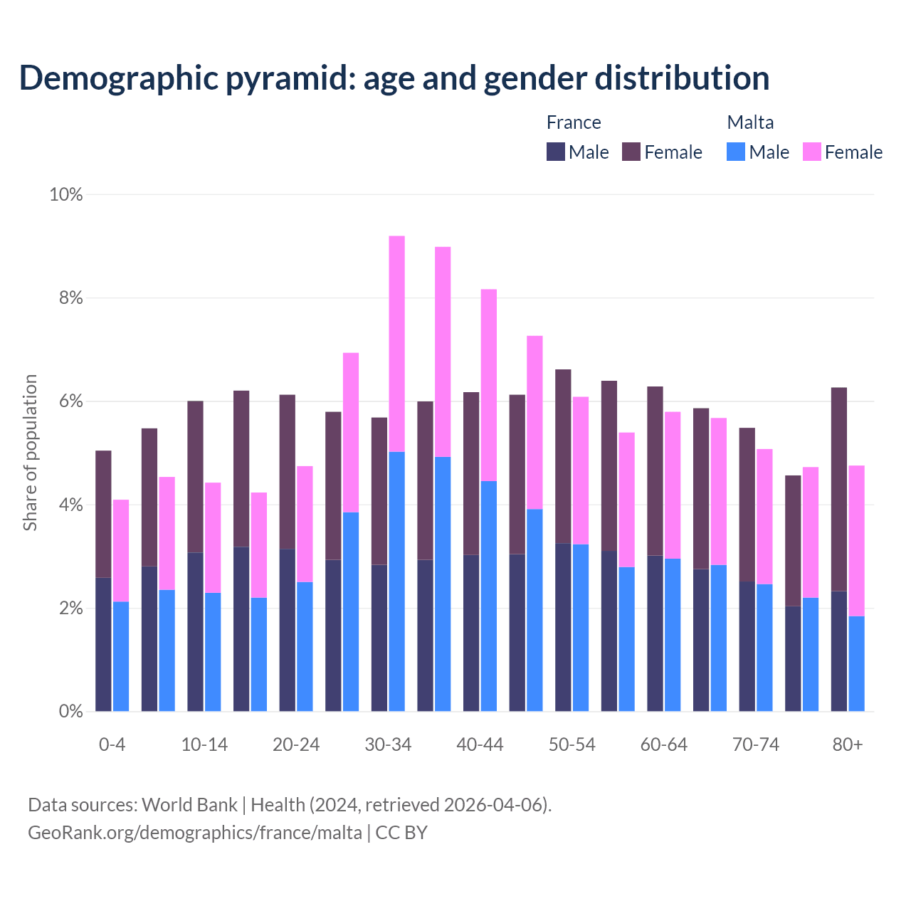 - France is ranked 29/196 by median age (oldest to youngest) vs 36/196 for Malta.
