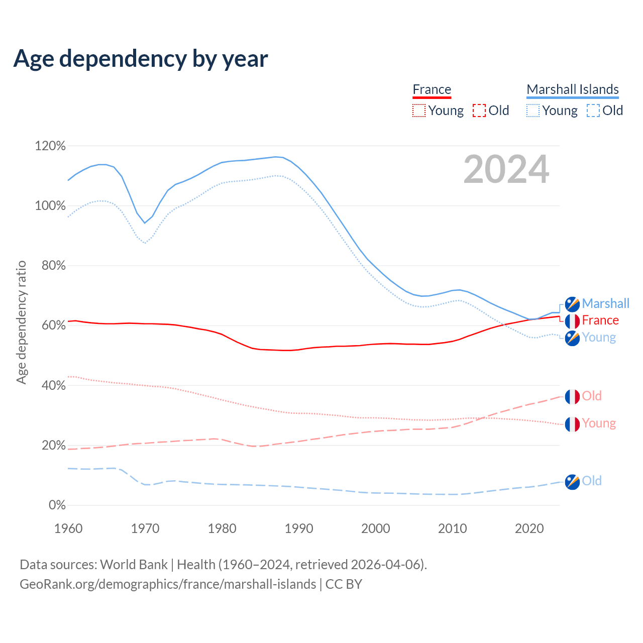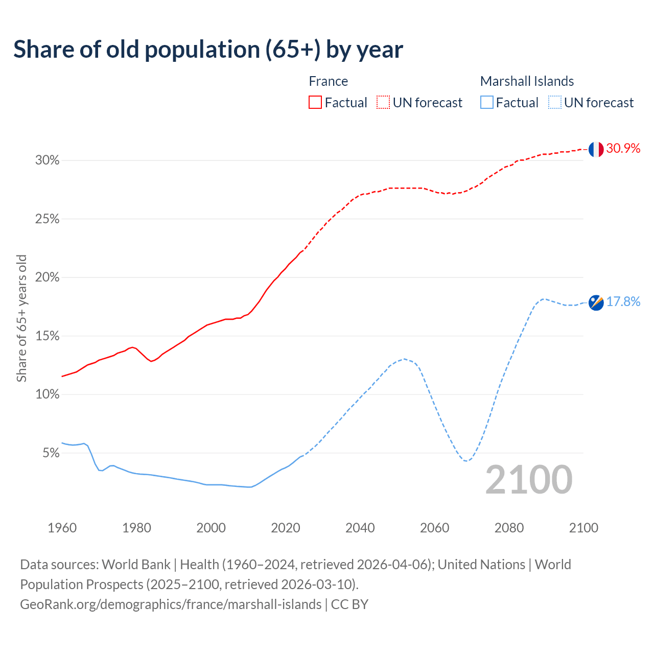 - The share of old-age demographic (65+) in France is 22.1% vs 4.64% in the Marshall Islands.