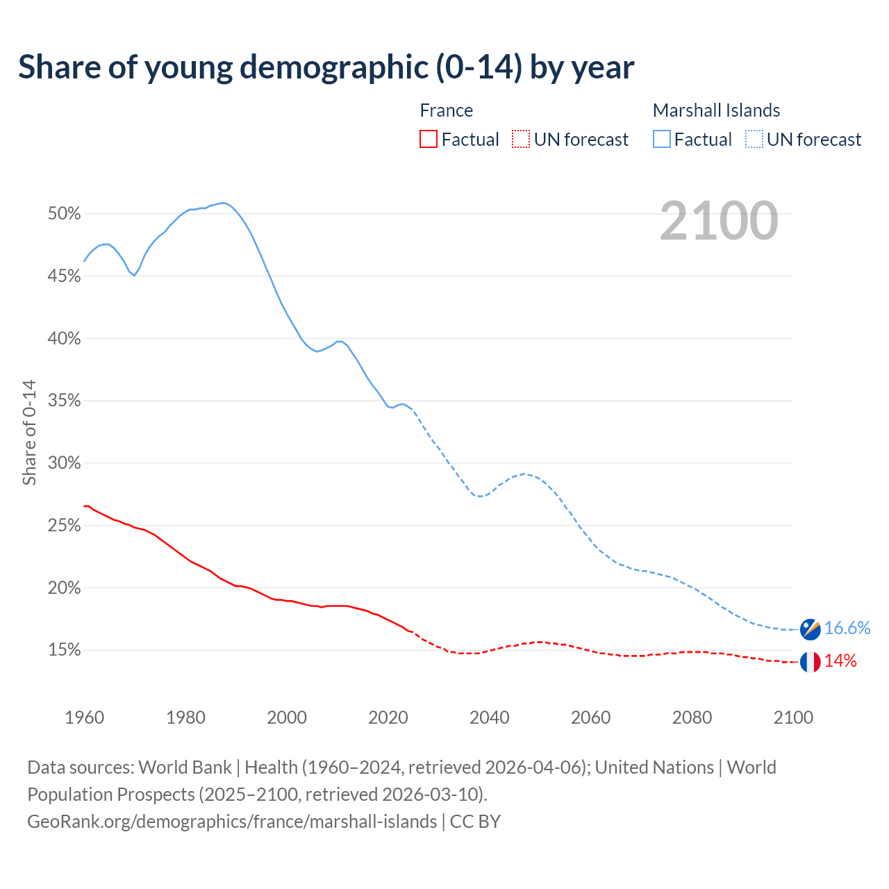 - The share of young demographic (0-15 years old) in France is 16.5% vs 34.5% in the Marshall Islands.