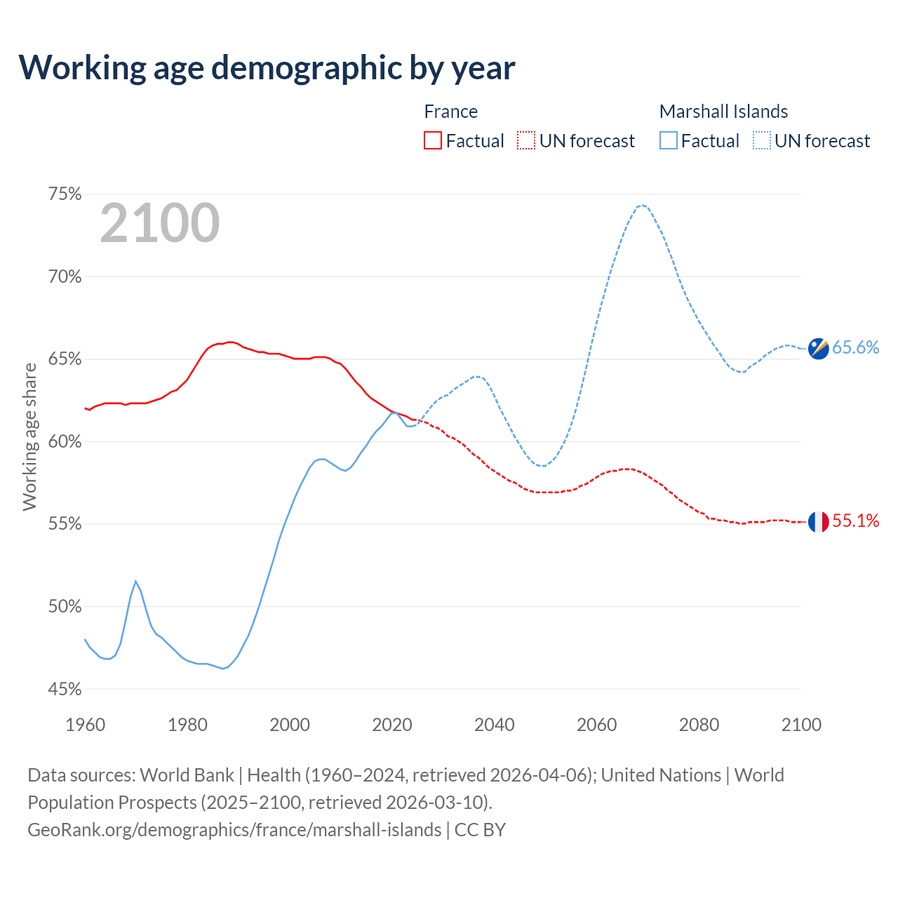 - France has 42.2M working age adults (aged 15-64) vs 21.3K in the Marshall Islands.