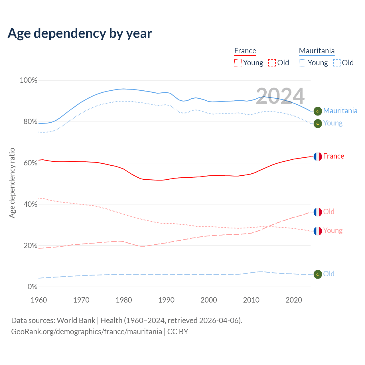 - France is ranked 29/196 by median age (oldest to youngest) vs 185/196 for Mauritania.