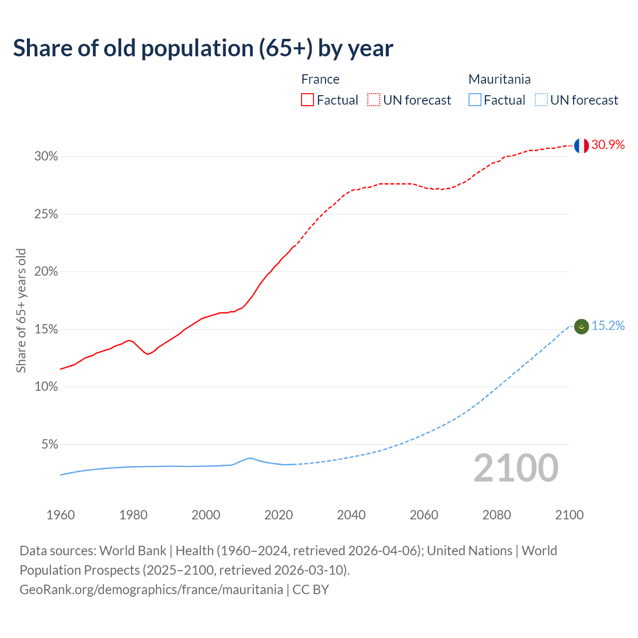 The share of older people aged 65 and over is 22.1% in France and 3.23% in Mauritania. Life expectancy in France compared to Mauritania .