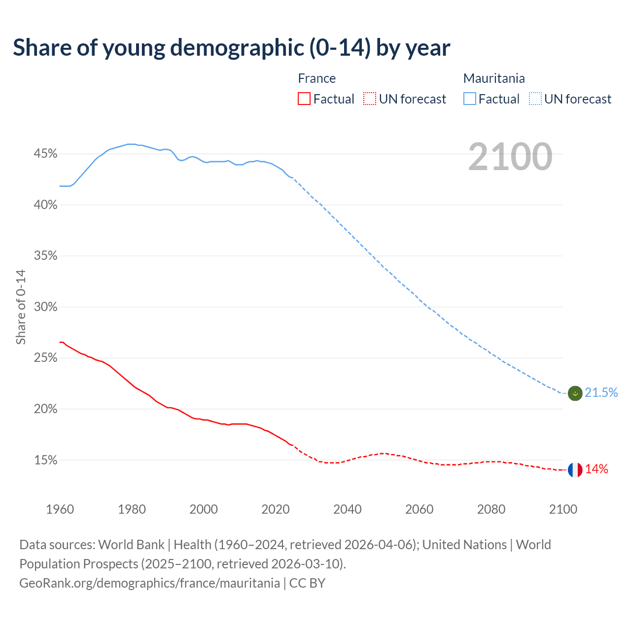 - The share of young demographic (0-15 years old) in France is 16.5% vs 42.7% in Mauritania.
