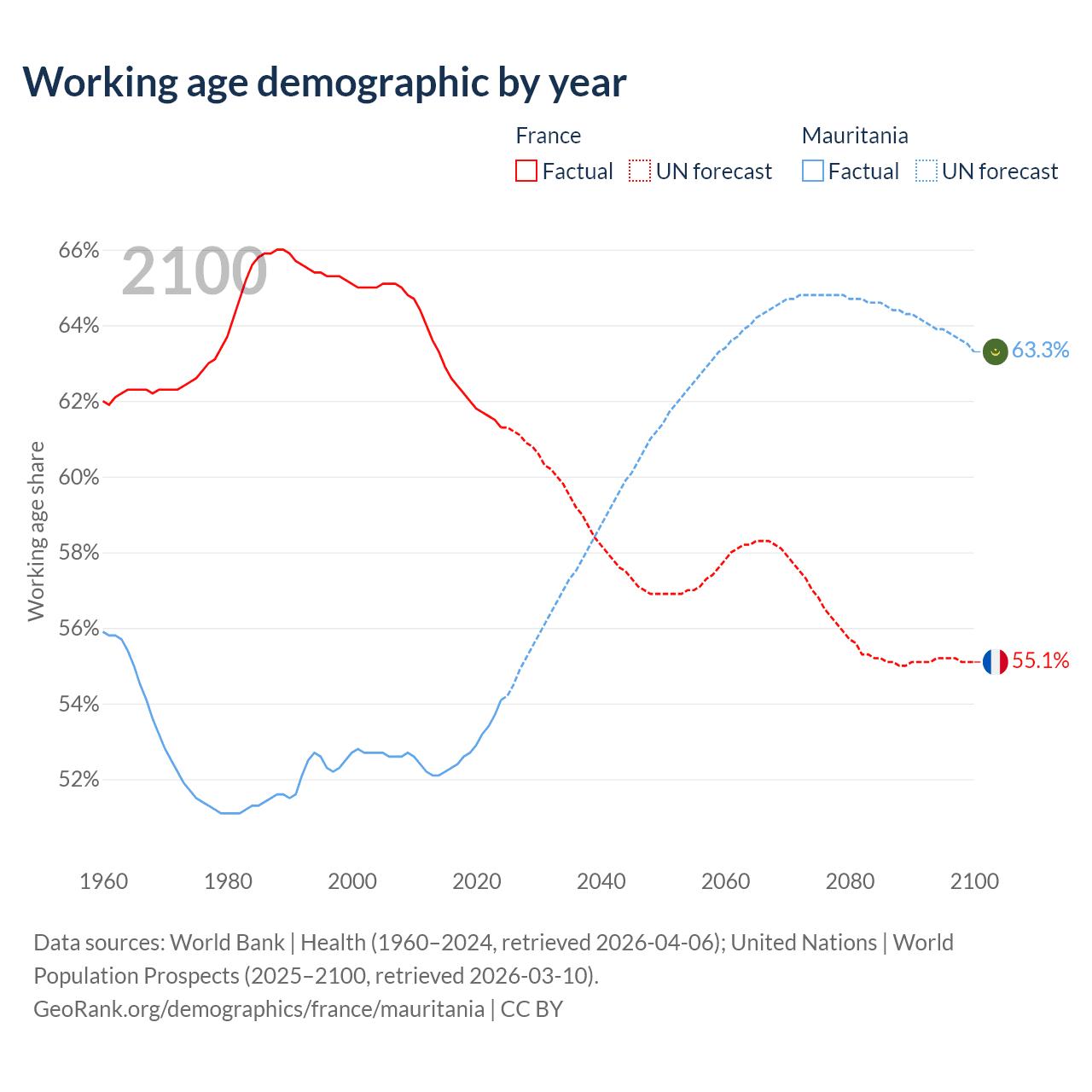 - France has 42.2M working age adults (aged 15-64) vs 2.98M in Mauritania.