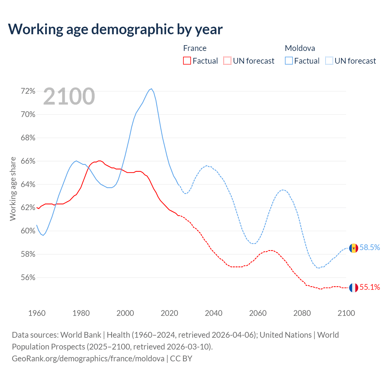 - The share of old-age demographic (65+) in France is 22.1% vs 16.2% in Moldova.