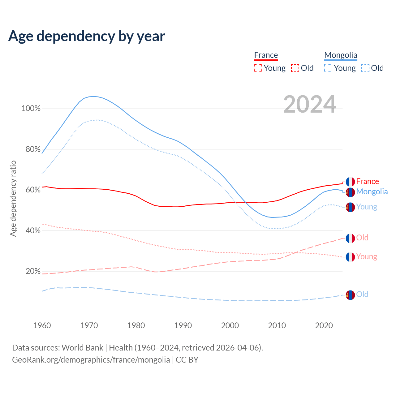 - France is ranked 29/196 by median age (oldest to youngest) vs 117/196 for Mongolia.