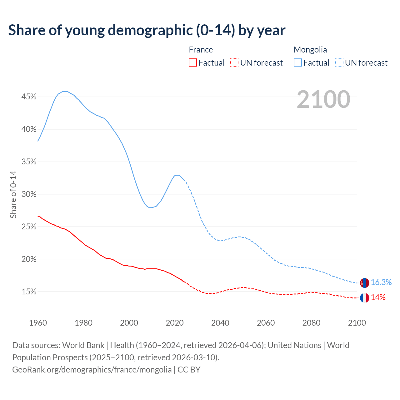 - The share of young demographic (0-15 years old) in France is 16.5% vs 32.2% in Mongolia.