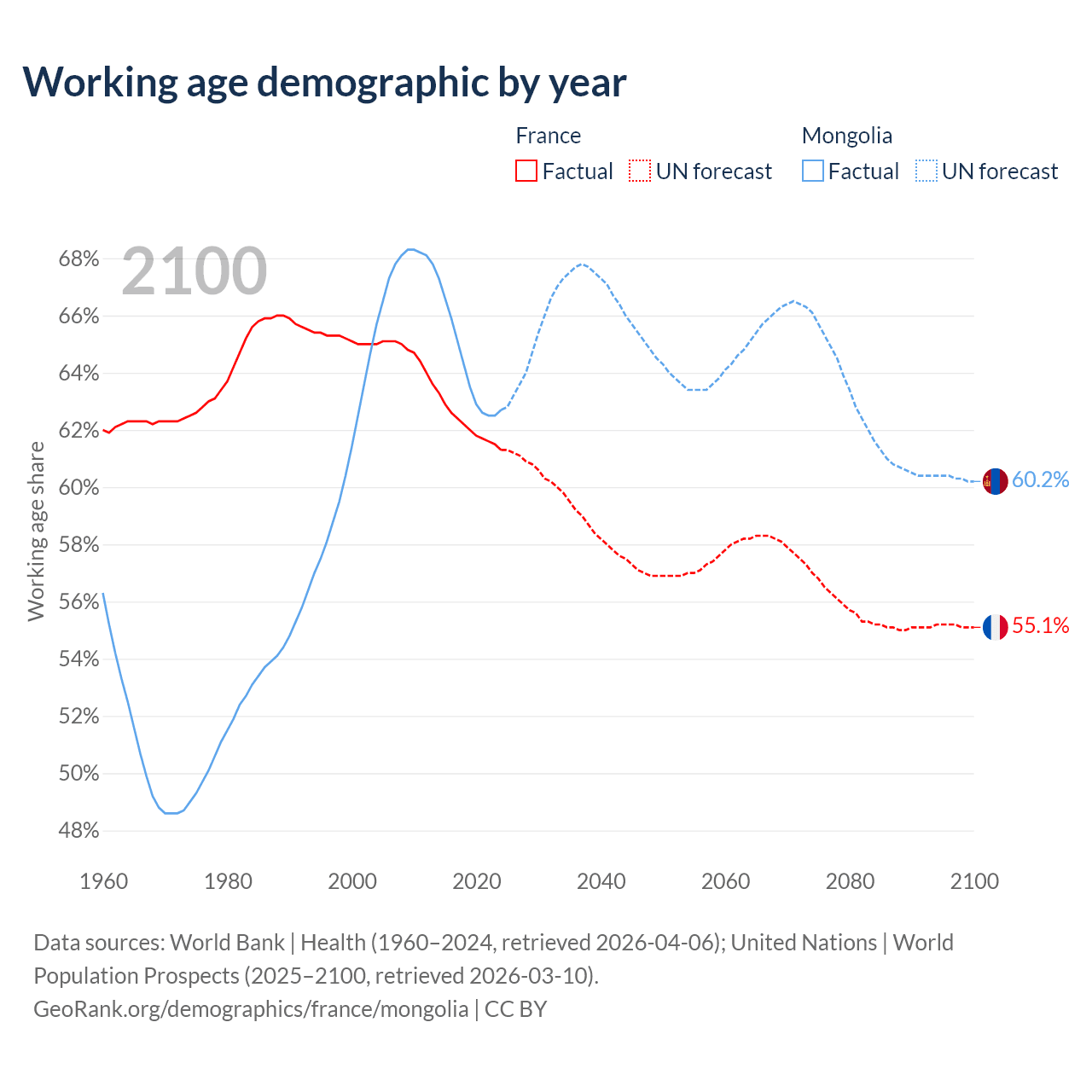 - France has 42.2M working age adults (aged 15-64) vs 2.27M in Mongolia.