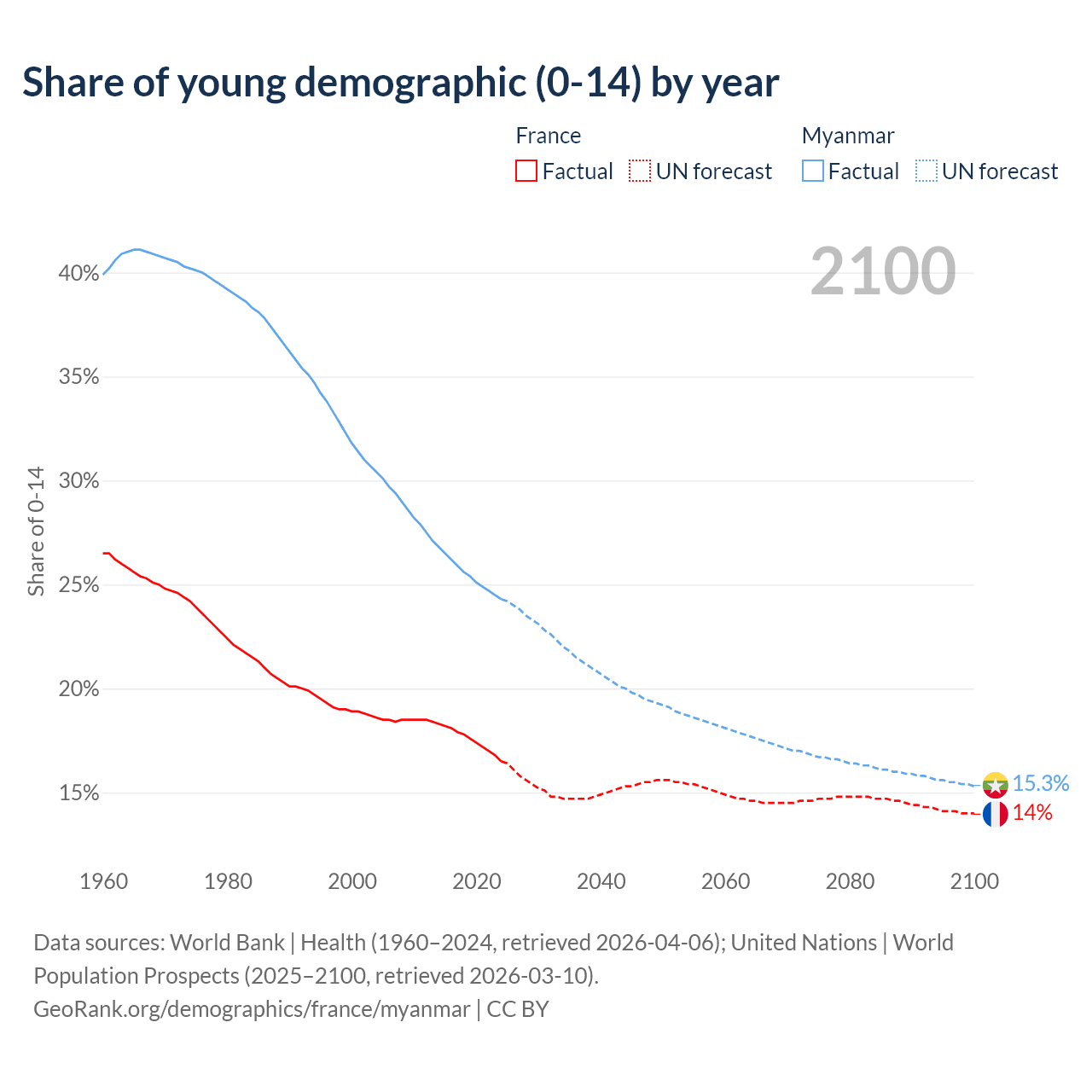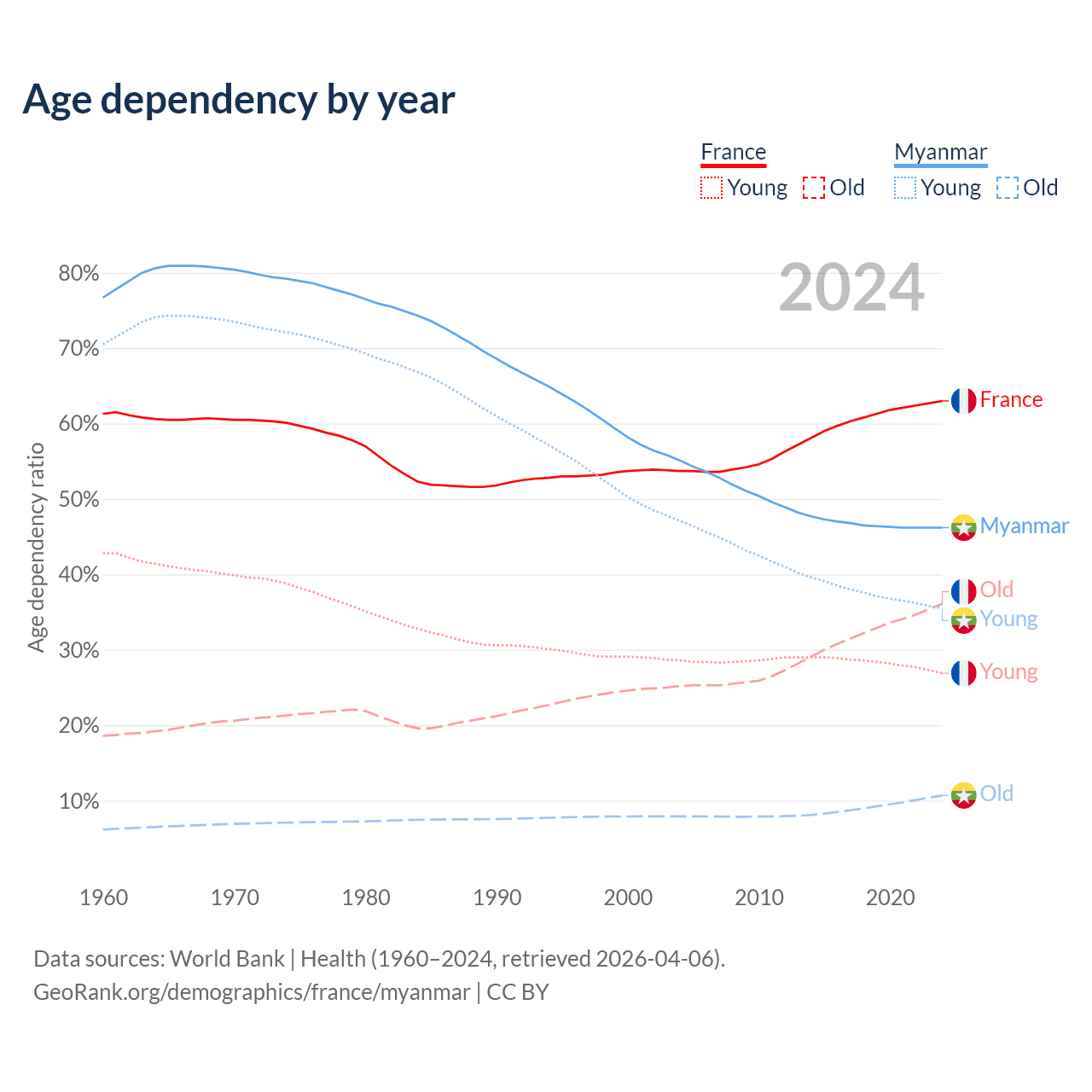- France is ranked 29/196 by median age (oldest to youngest) vs 96/196 for Myanmar.