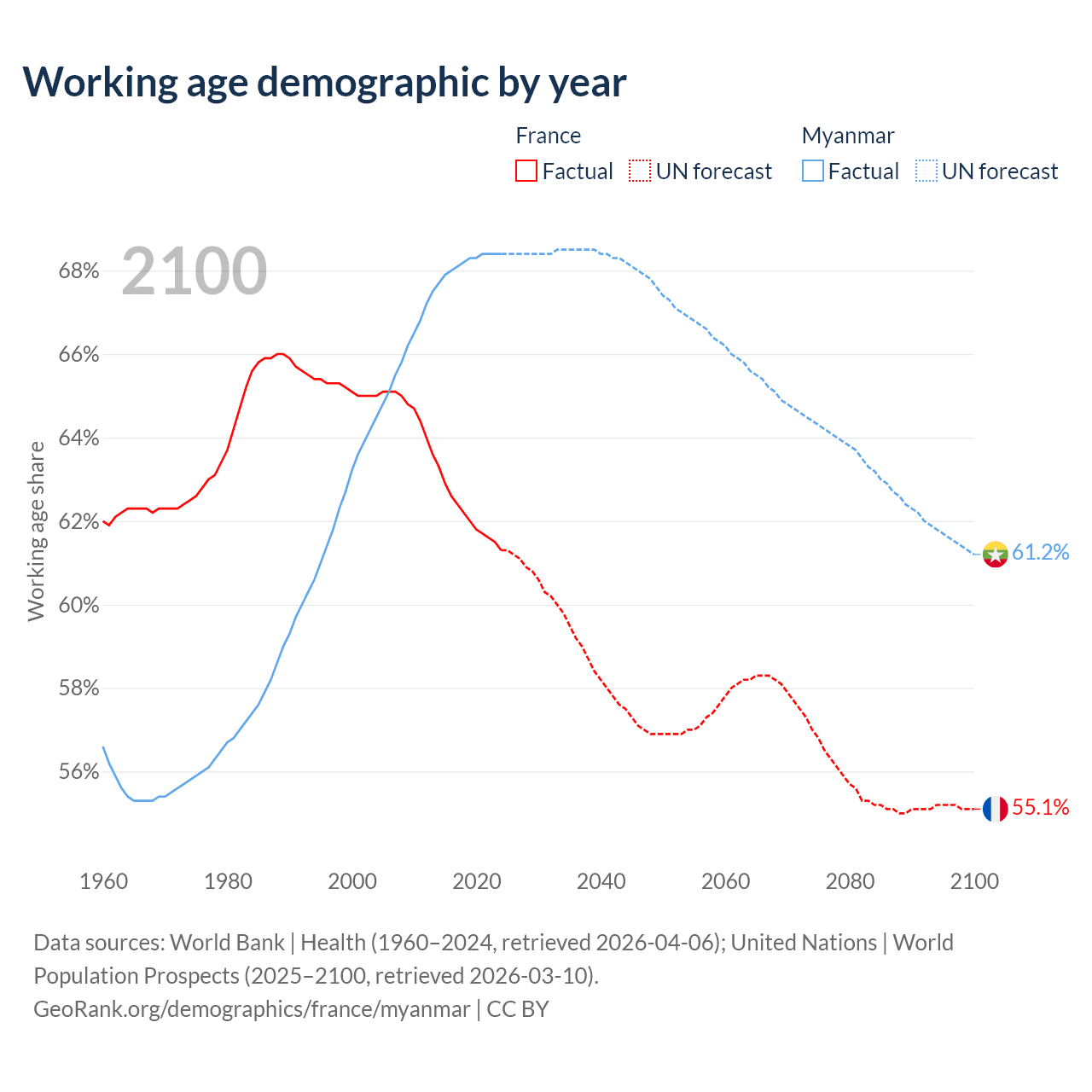 - France has 42.2M working age adults (aged 15-64) vs 37.8M in Myanmar.