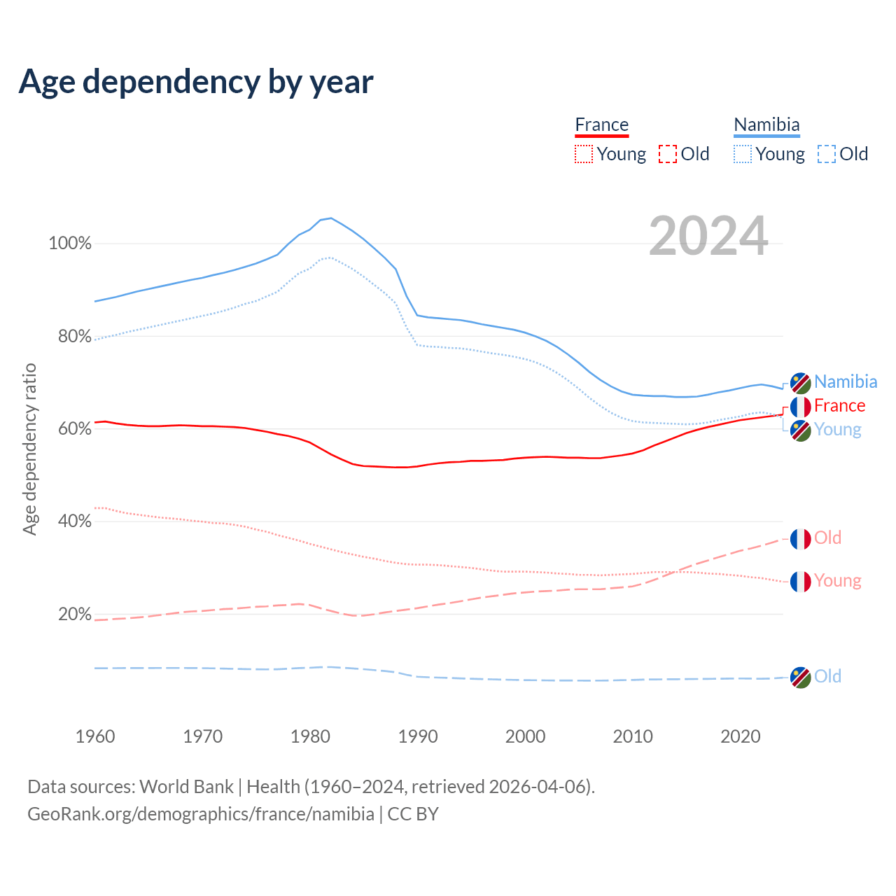- France is ranked 29/196 by median age (oldest to youngest) vs 147/196 for Namibia.