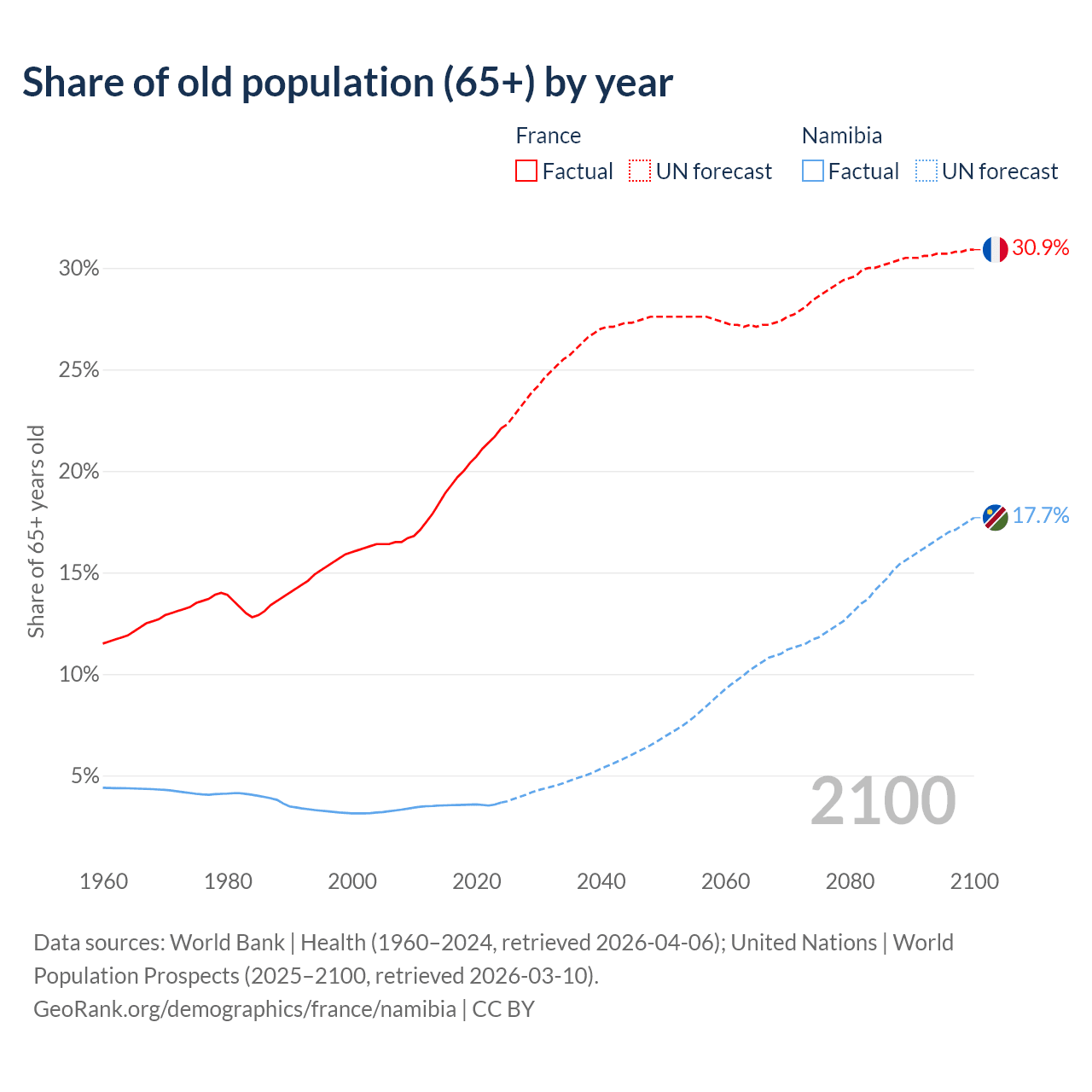 The share of older people aged 65 and over is 22.1% in France and 3.67% in Namibia. Life expectancy in France compared to Namibia .