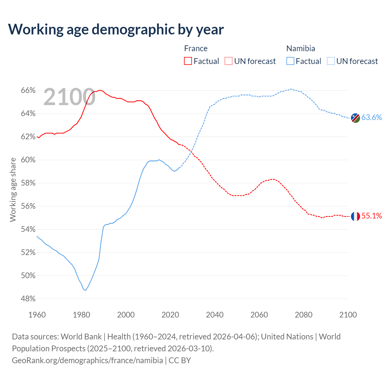- France has 42.2M working age adults (aged 15-64) vs 1.88M in Namibia.