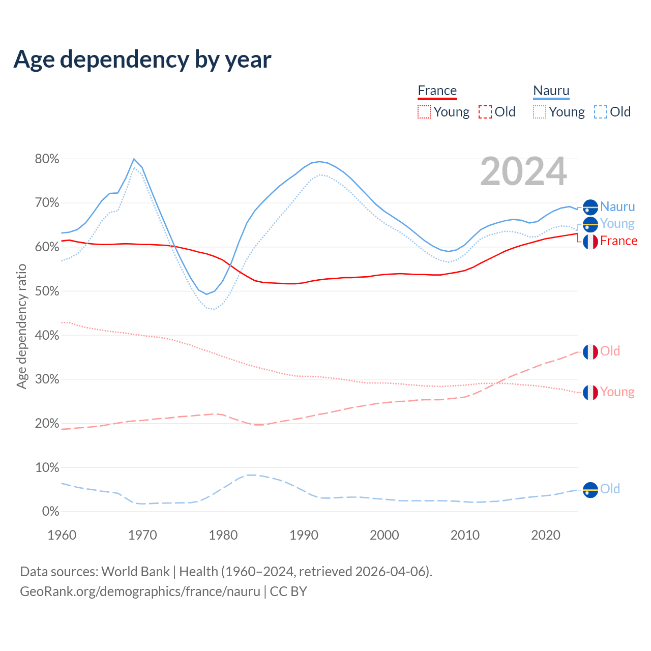 - France is ranked 29/196 by median age (oldest to youngest) vs 155/196 for Nauru.