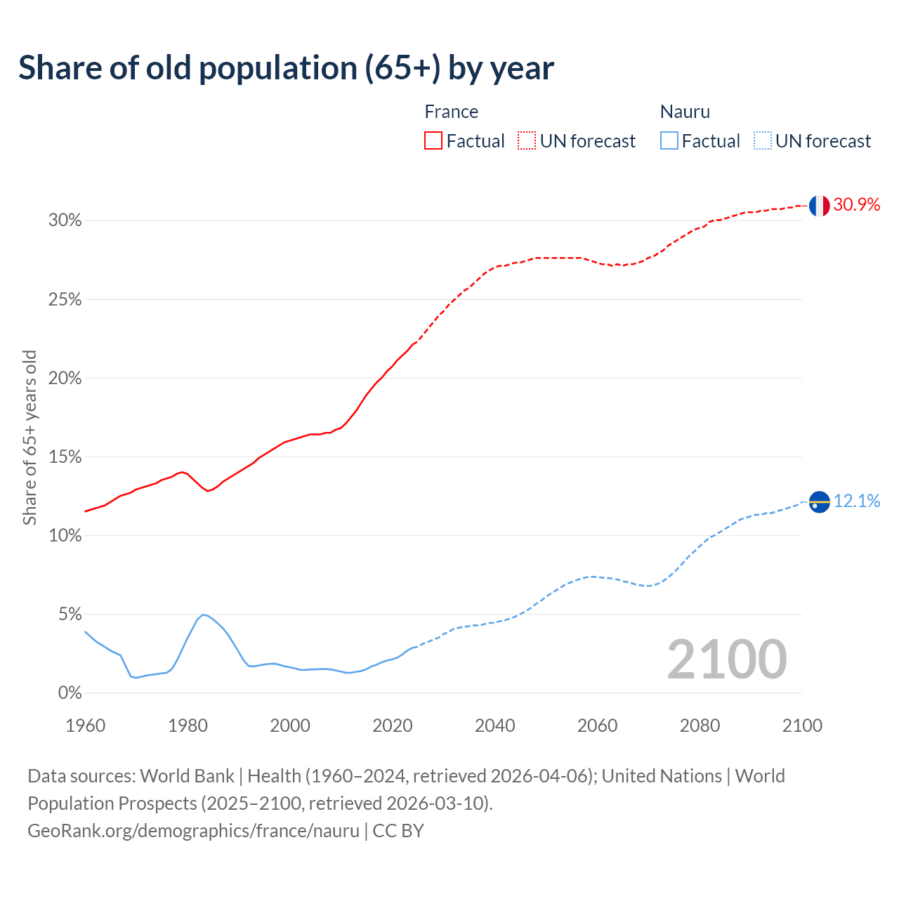 The share of older people aged 65 and over is 22.1% in France and 2.85% in Nauru. Life expectancy in France compared to Nauru .