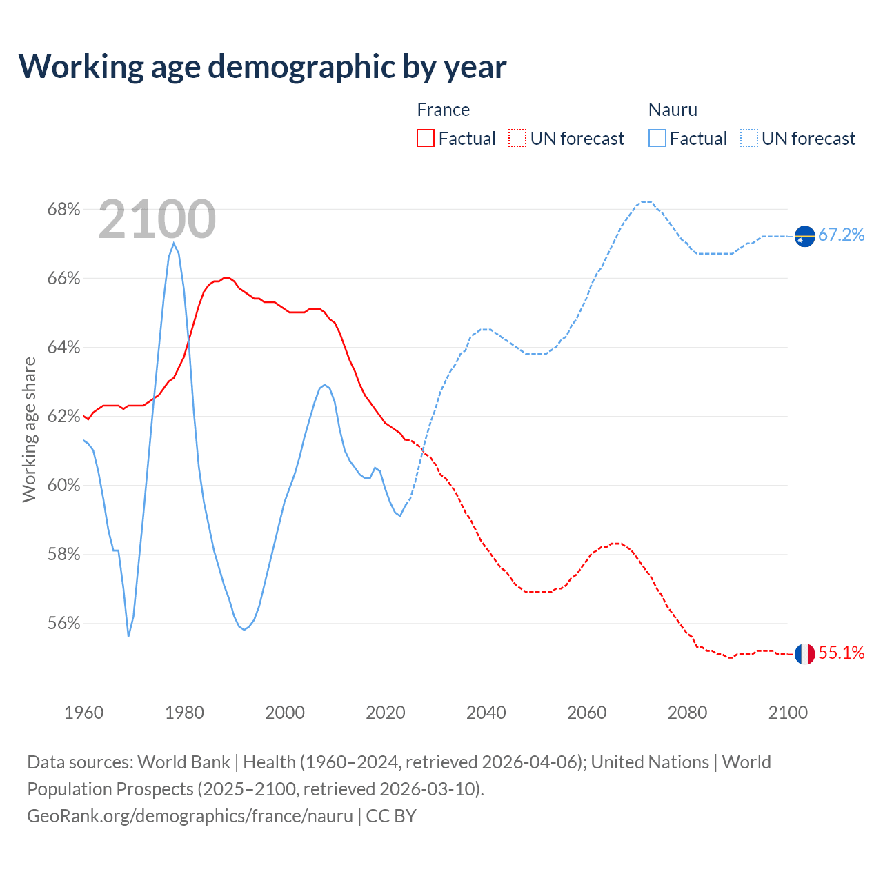 - France has 42.2M working age adults (aged 15-64) vs 7.2K in Nauru.