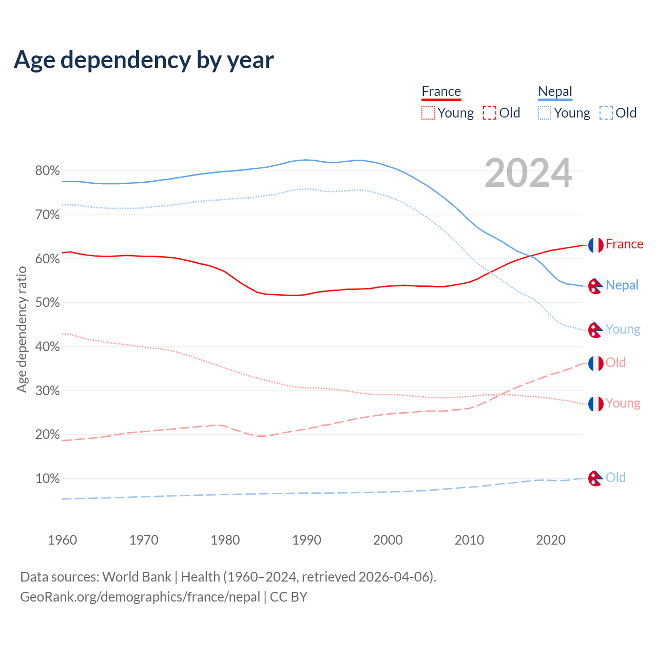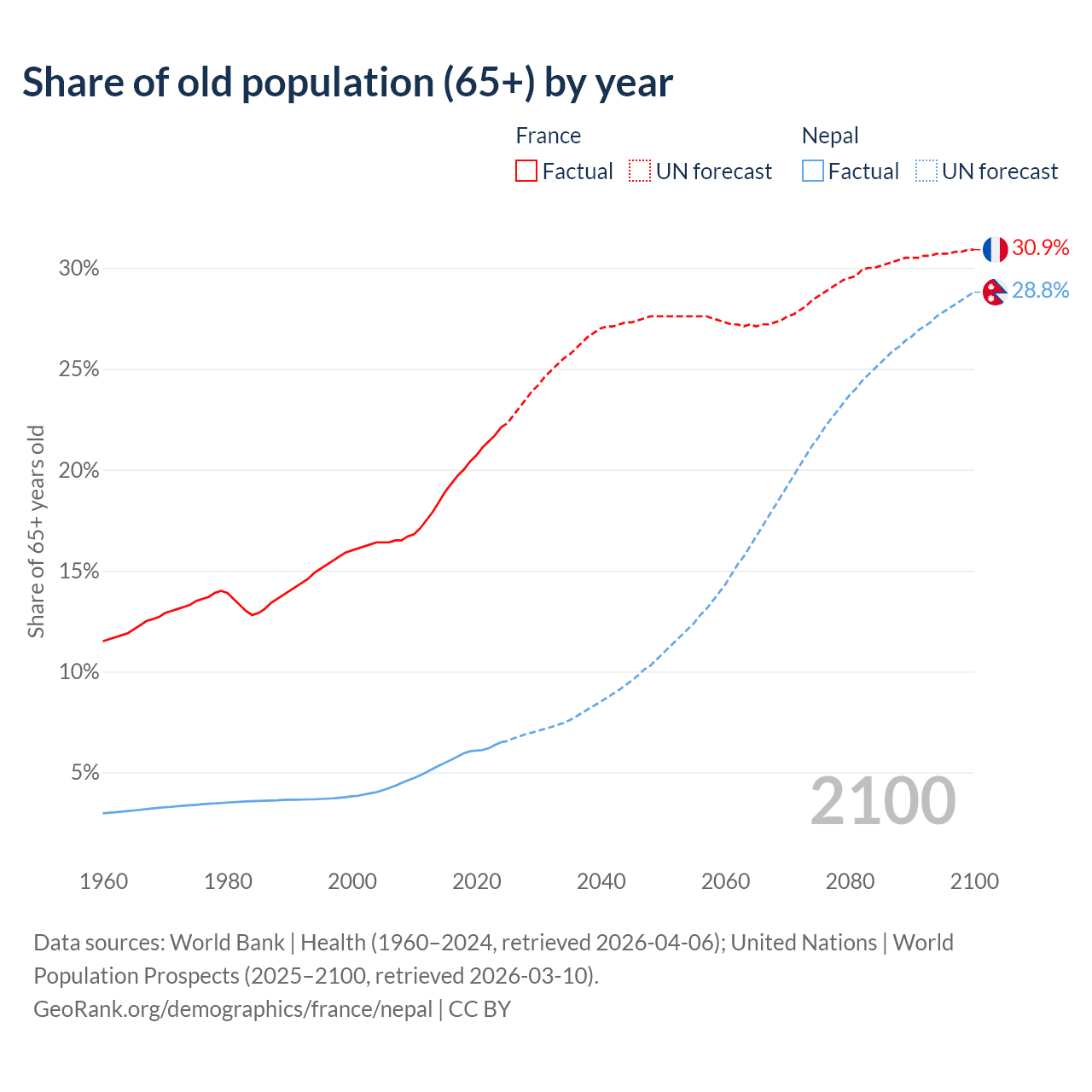 - The share of old-age demographic (65+) in France is 22.1% vs 6.5% in Nepal.