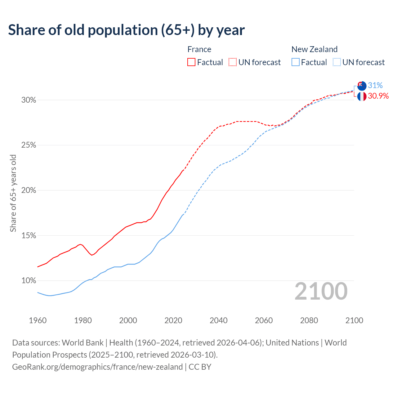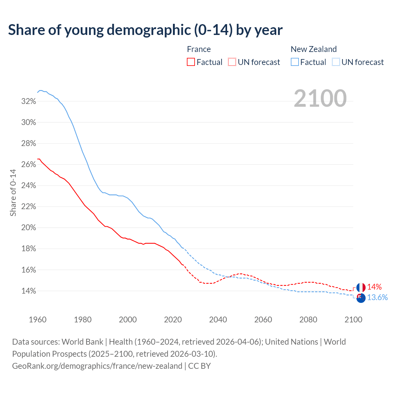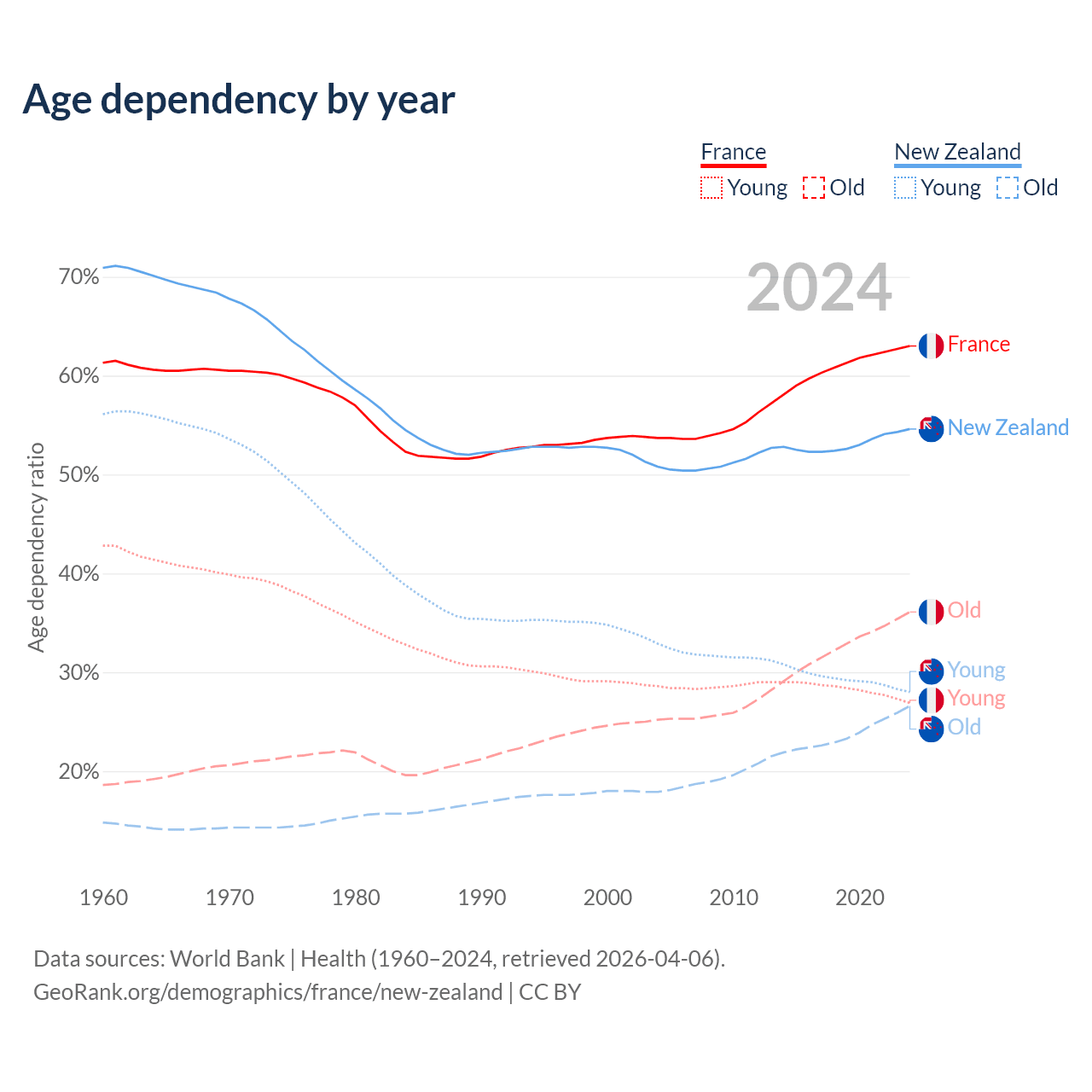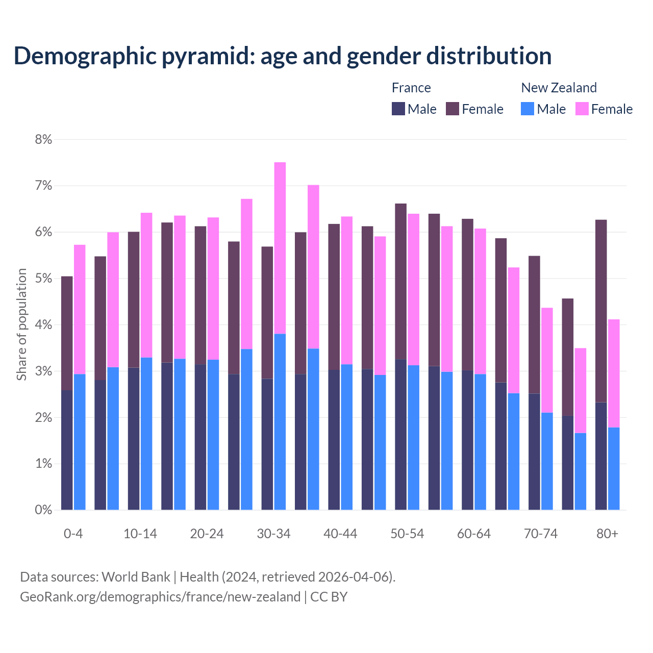 - France is ranked 29/196 by median age (oldest to youngest) vs 56/196 for New Zealand.