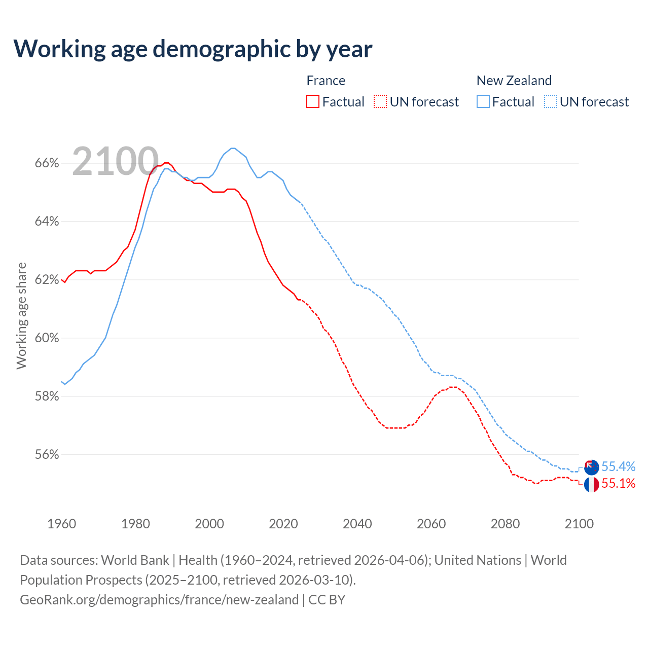 - France has 42.2M working age adults (aged 15-64) vs 3.48M in New Zealand.