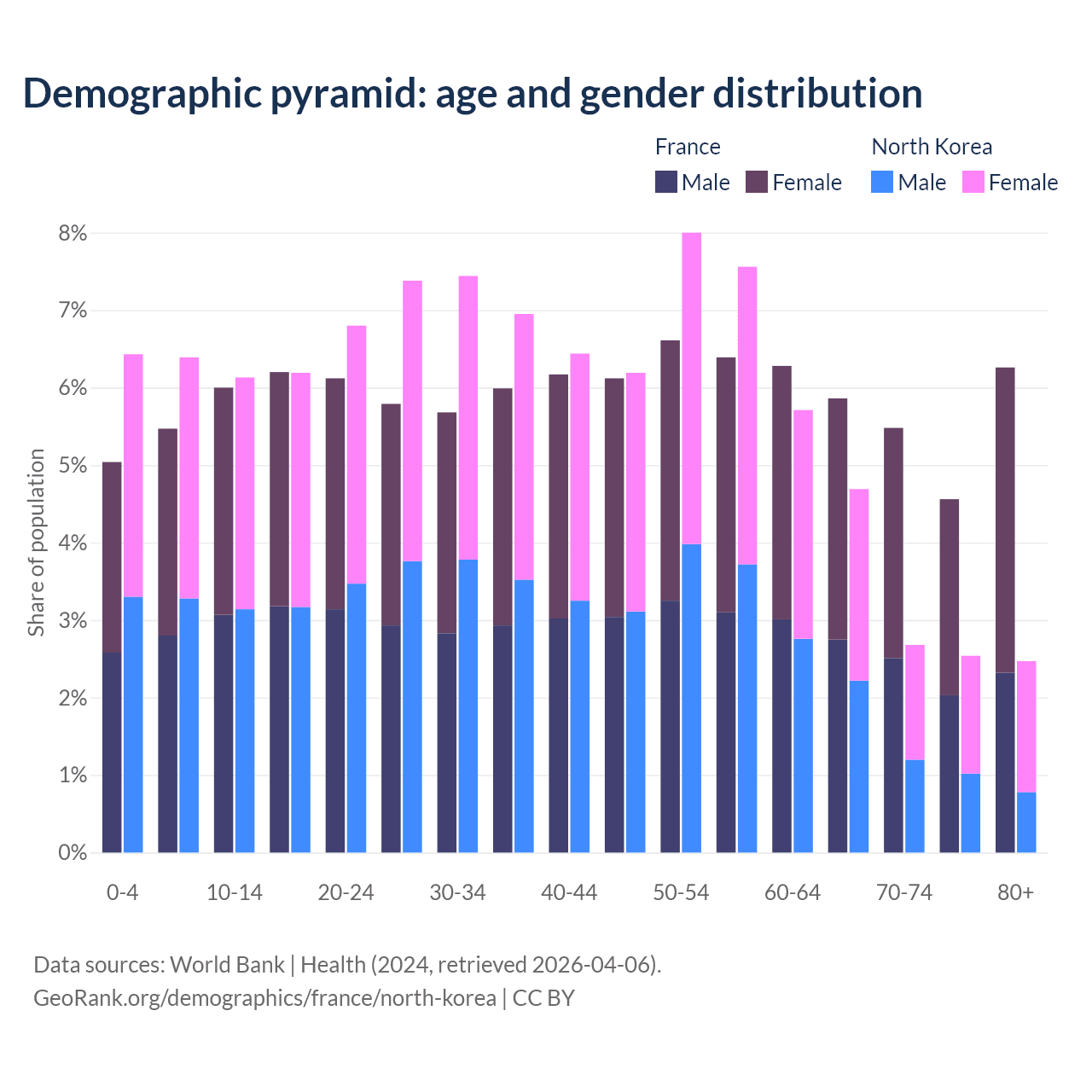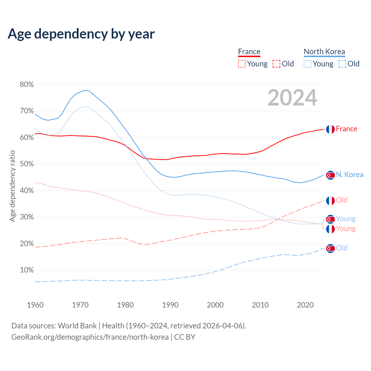 - France is ranked 29/196 by median age (oldest to youngest) vs 62/196 for North Korea.
