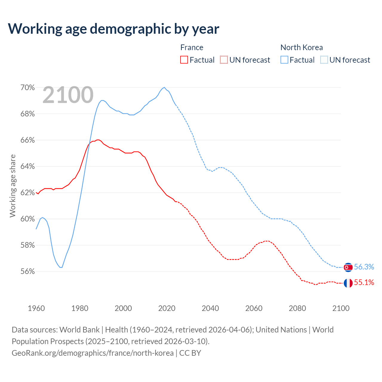 - France has 42.2M working age adults (aged 15-64) vs 18.3M in North Korea.