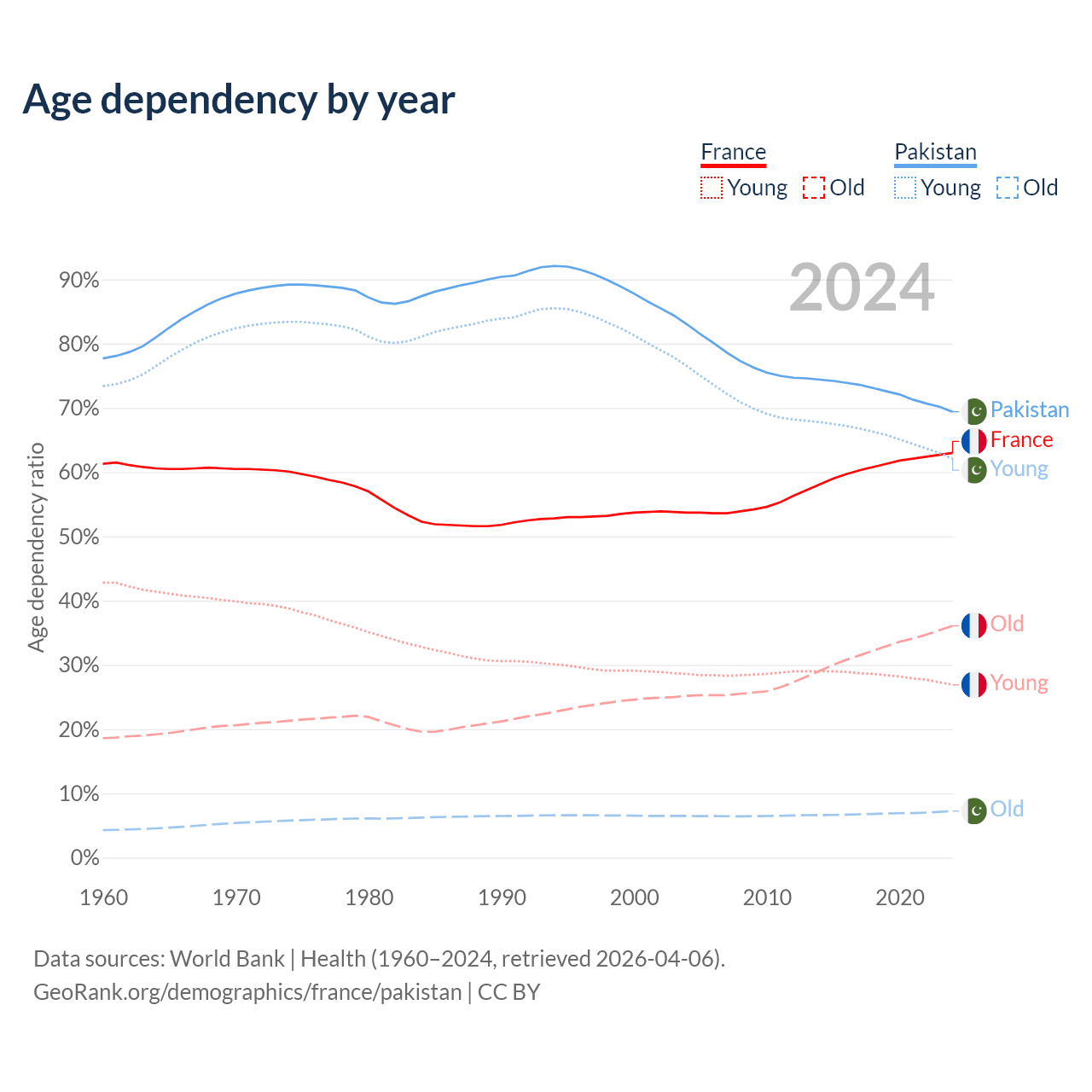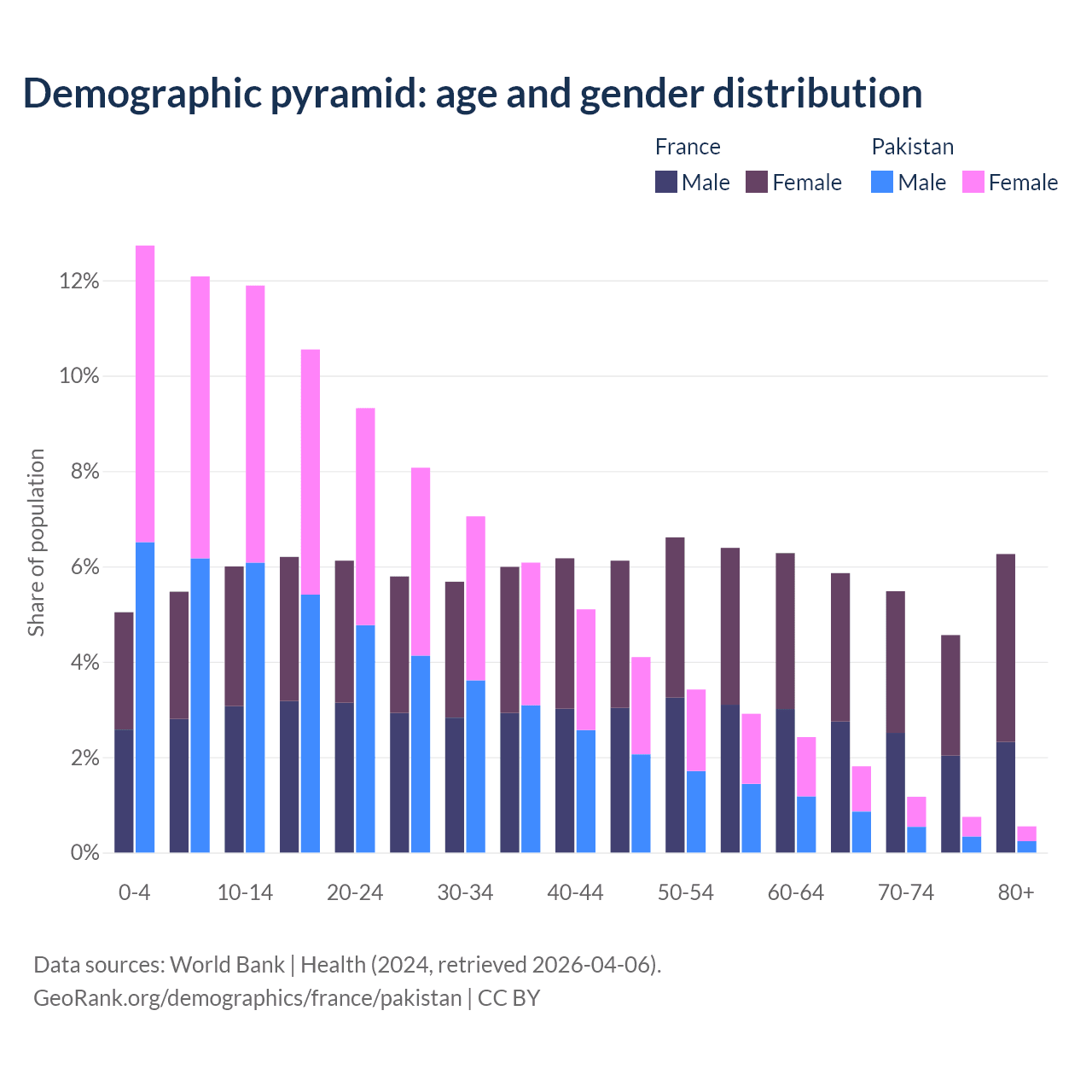 - France is ranked 29/196 by median age (oldest to youngest) vs 154/196 for Pakistan.