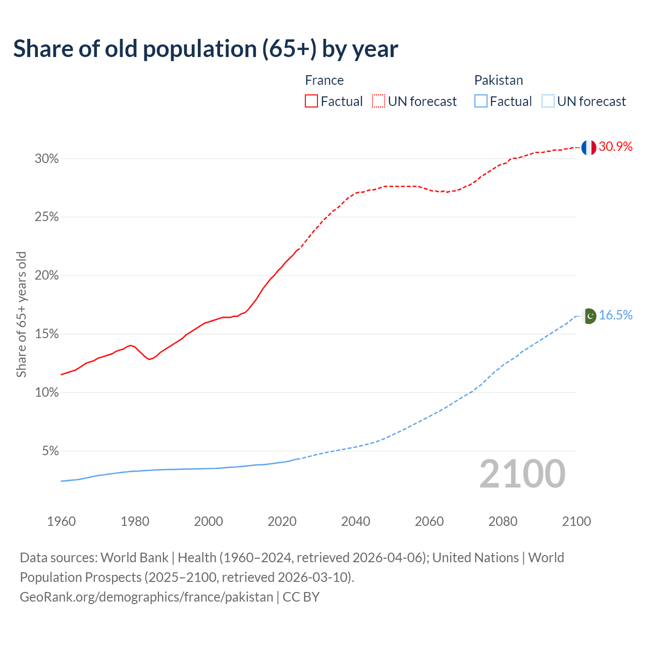 - The share of old-age demographic (65+) in France is 22.1% vs 4.28% in Pakistan.