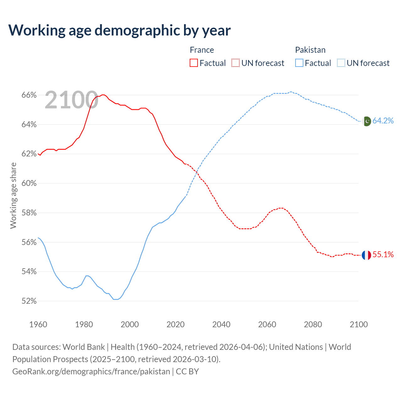 - France has 42.2M working age adults (aged 15-64) vs 154M in Pakistan.