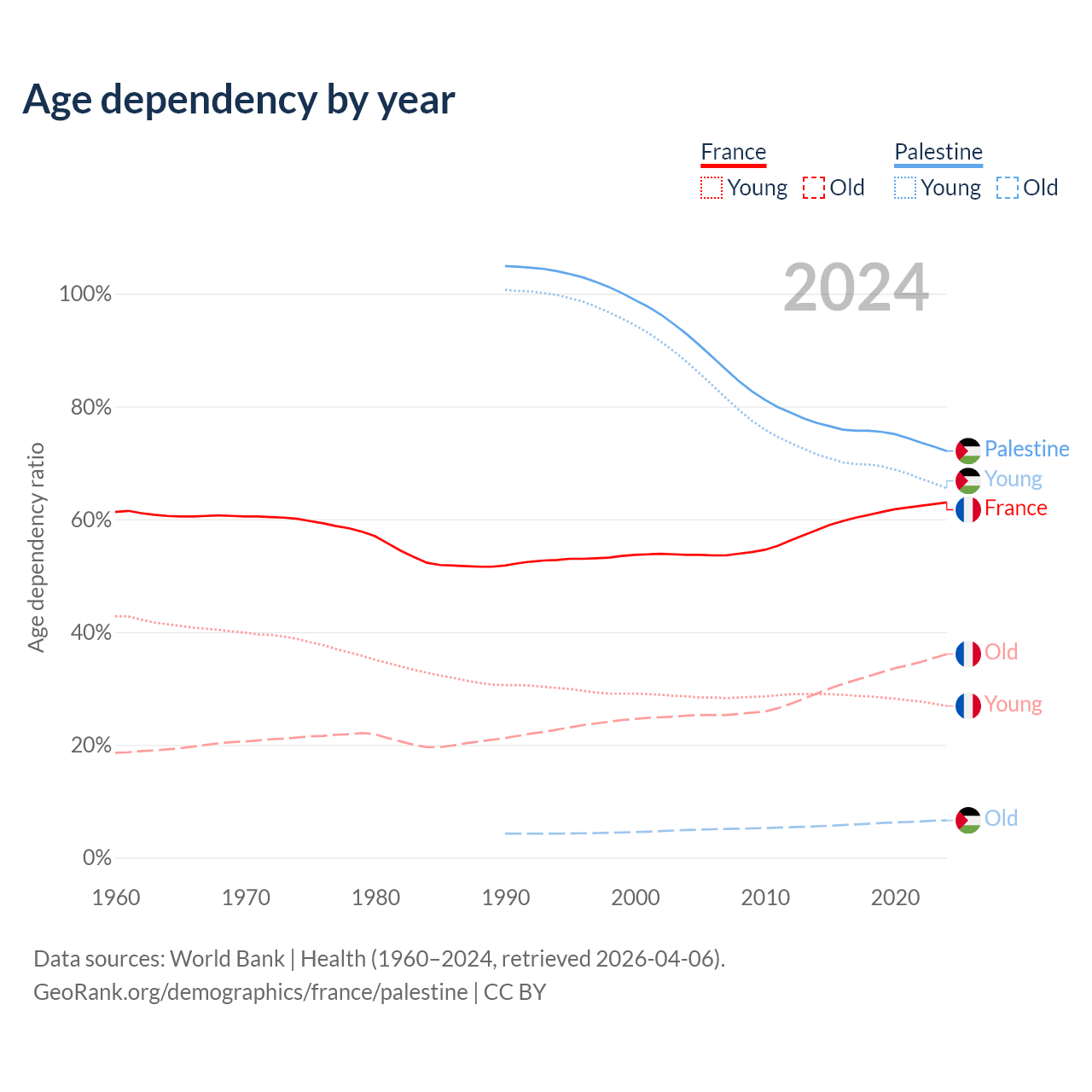 - France is ranked 29/196 by median age (oldest to youngest) vs 157/196 for Palestine.