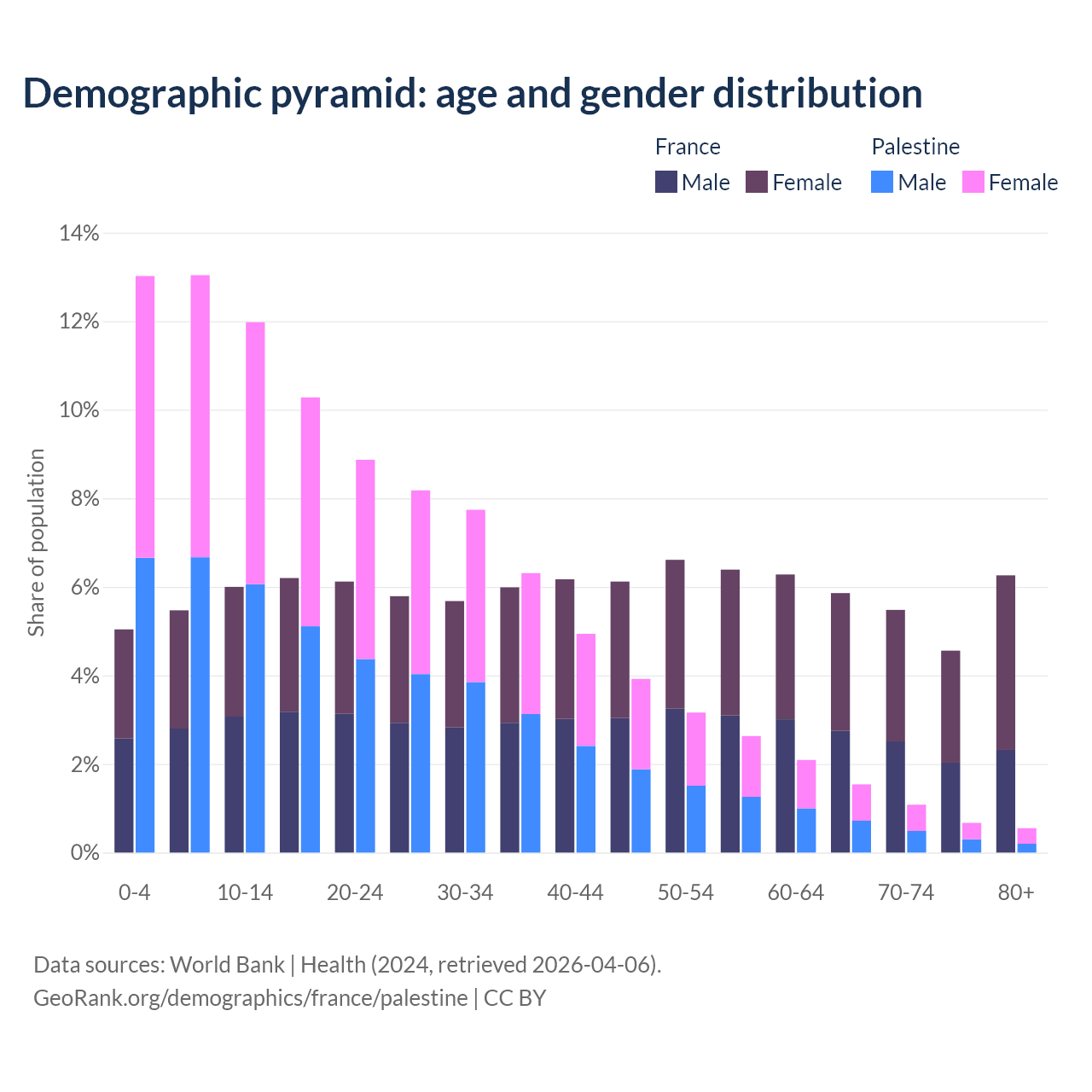 - As of 2026, the population of France is 68.8M vs 5.5M in Palestine - 12.5 times difference.