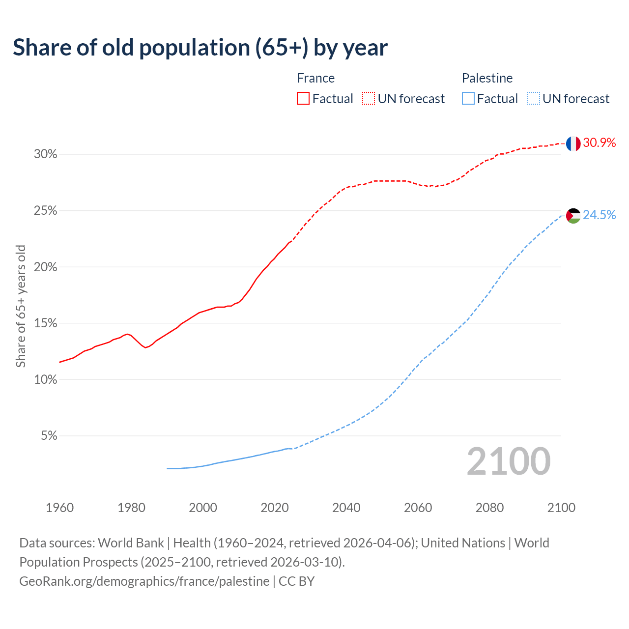 - The share of old-age demographic (65+) in France is 22.1% vs 3.84% in Palestine.