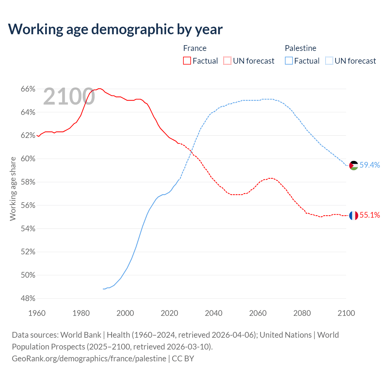 - France has 42.2M working age adults (aged 15-64) vs 3.2M in Palestine.