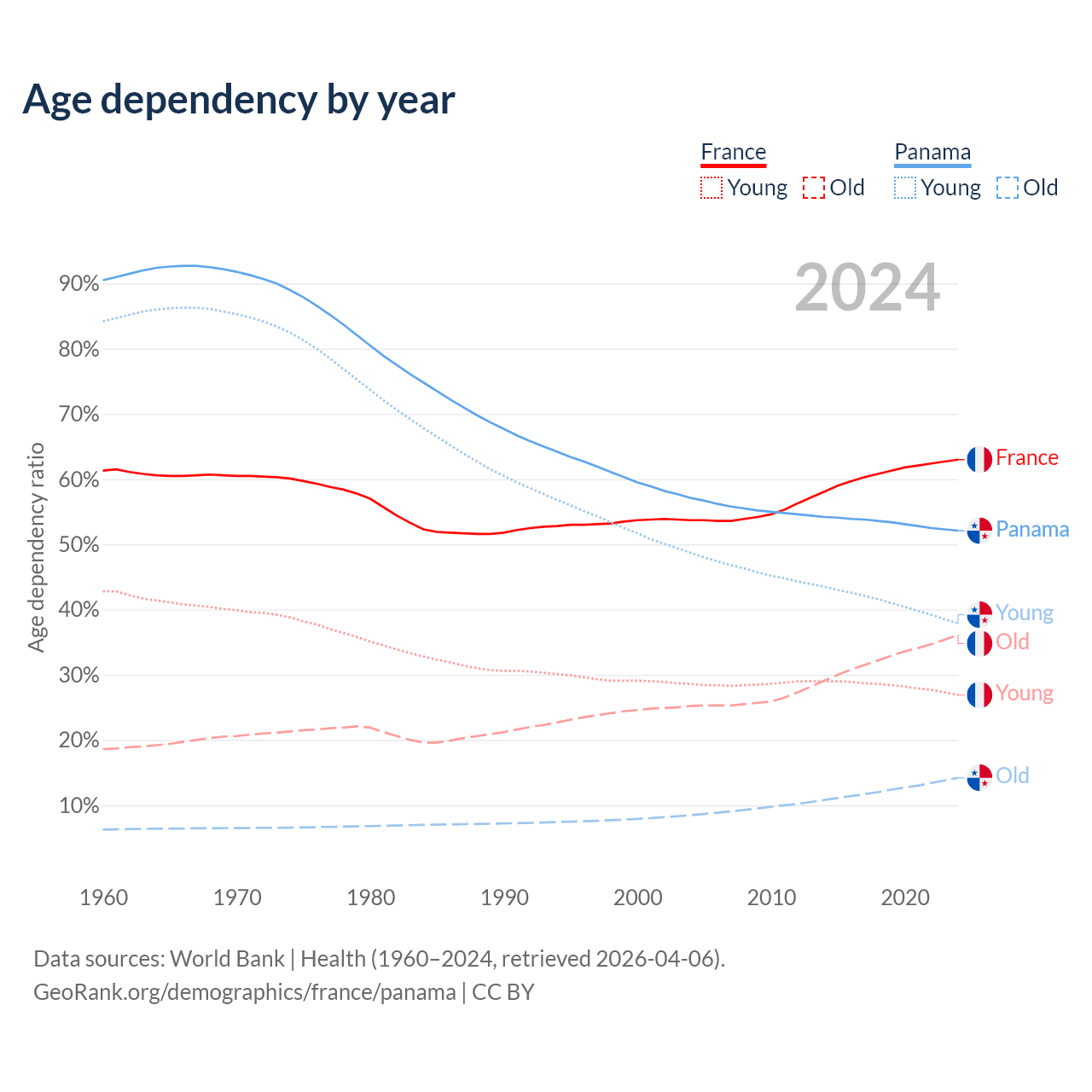 - France is ranked 29/196 by median age (oldest to youngest) vs 94/196 for Panama.